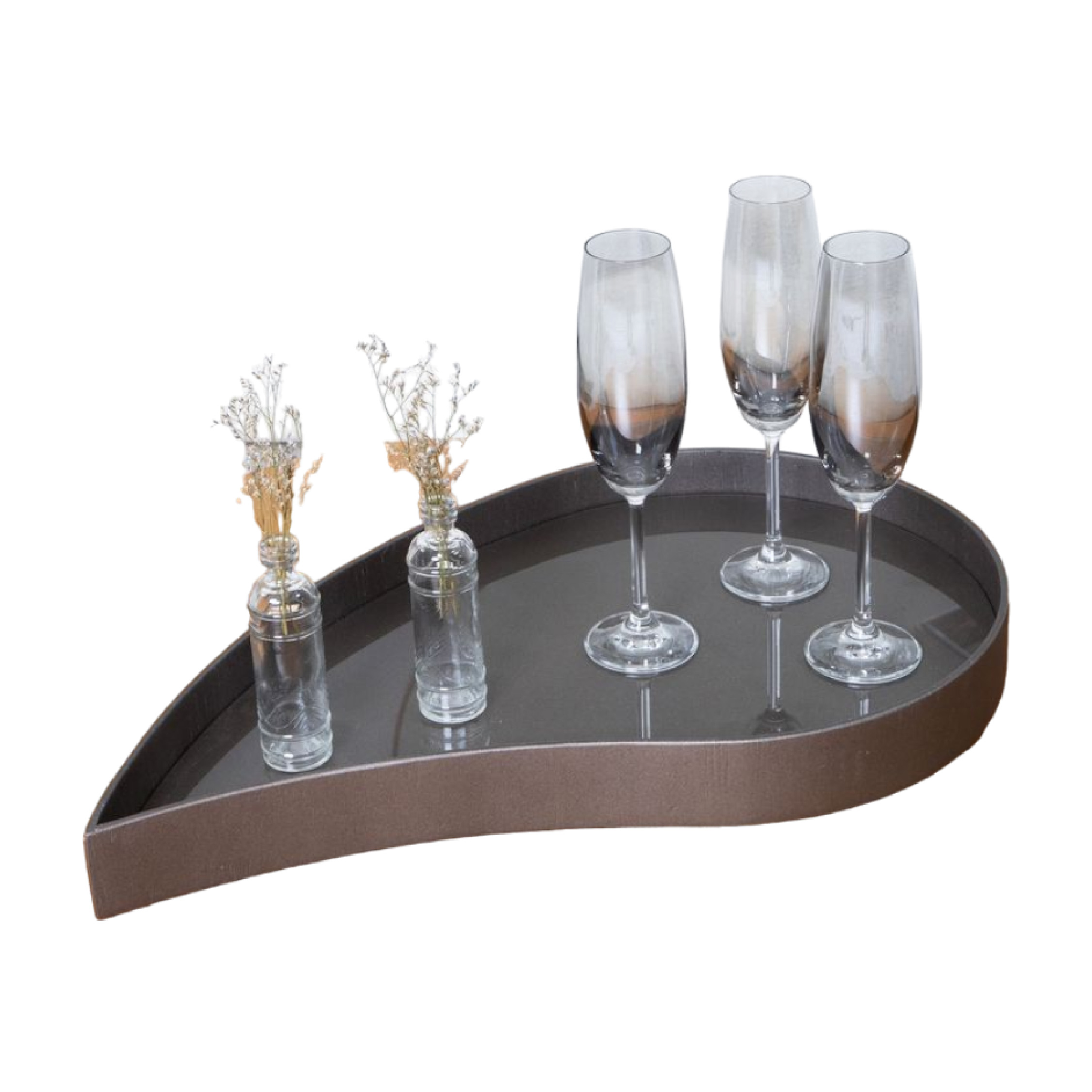 Espejo en forma de hoja con estructura en madera y marco delgado.