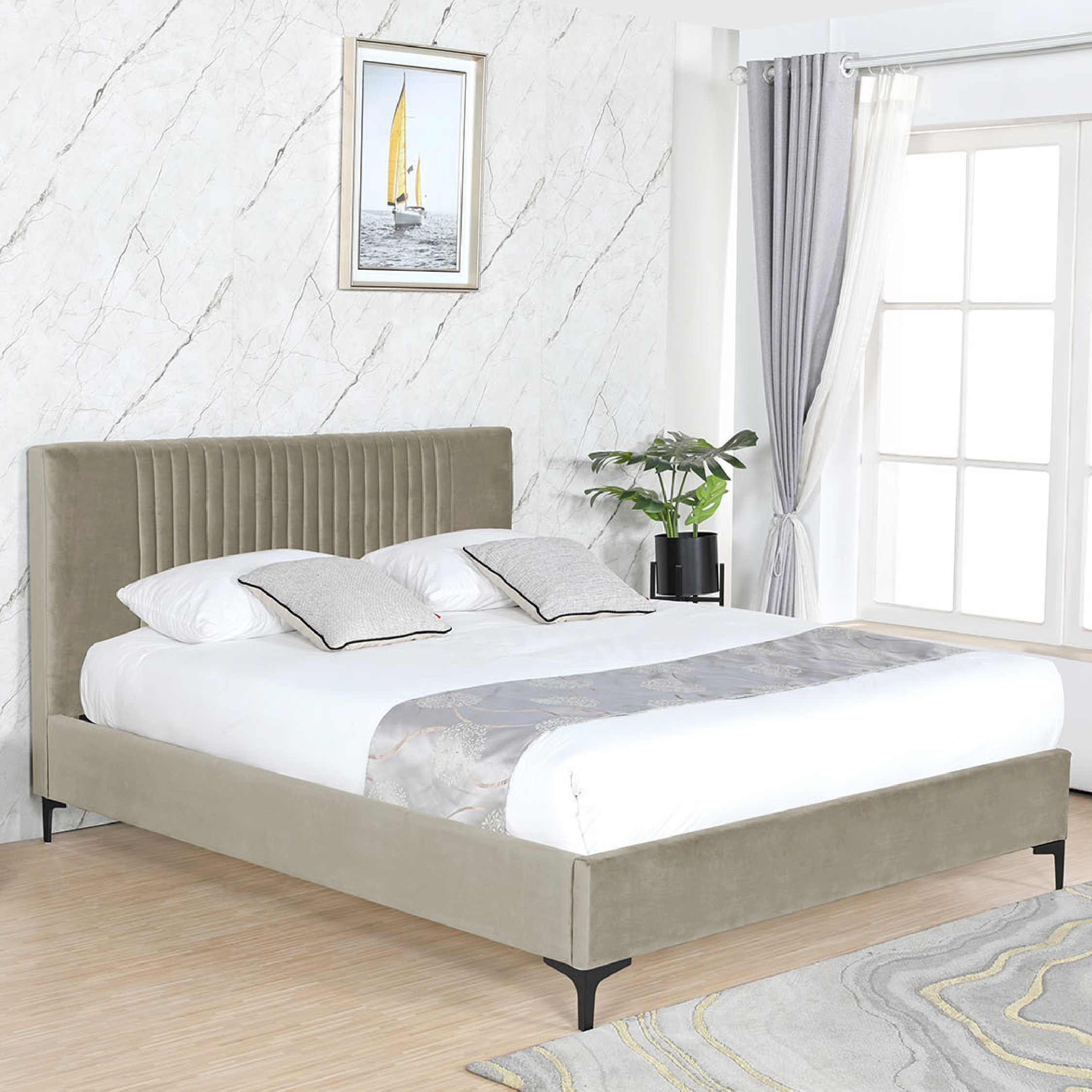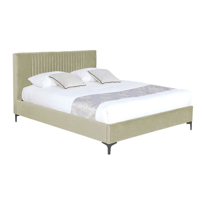 La Cama Tumi destaca por su presencia imponente y diseño sofisticado. Tapizada en velvet de textura suave y con un espaldar alto y abullonado, esta cama ofrece una sensación envolvente de confort y elegancia. Disponible en tres tamaños, se adapta fácilmente a distintos estilos de dormitorio, convirtiéndose en la pieza central del espacio.