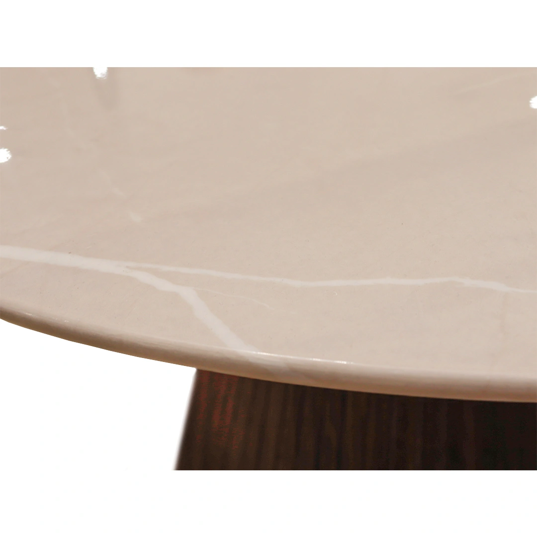 La Coffee Table Firul es una pieza de diseño que transforma tu sala en un espacio refinado. Su tapa circular de mármol natural crea un punto focal sofisticado, mientras que la base ripiada de madera en forma de cono le aporta calidez y carácter con un toque artesanal.