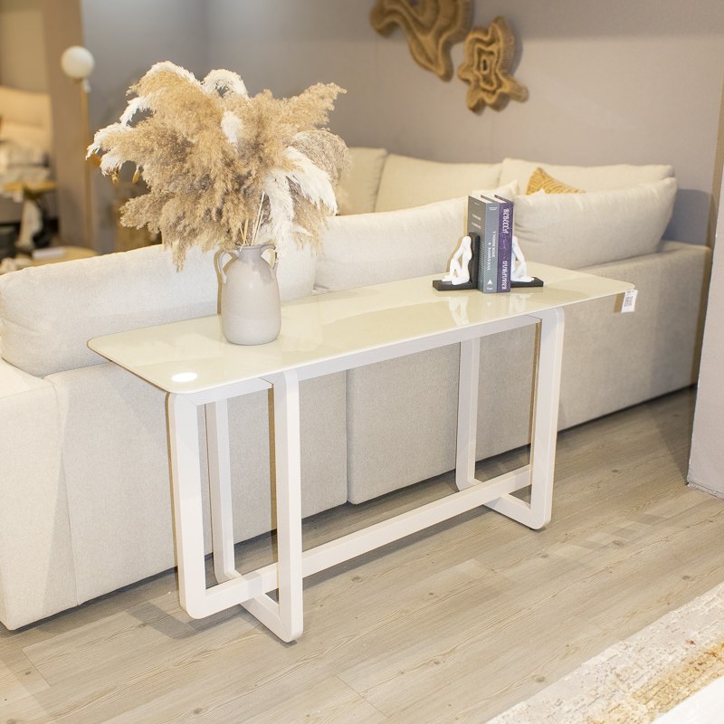La Consola Oasis presenta un sofisticado diseño que fusiona la modernidad con elegancia. Su base lineal, con una estructura en forma de rectángulo, ofrece solidez y un estilo minimalista.