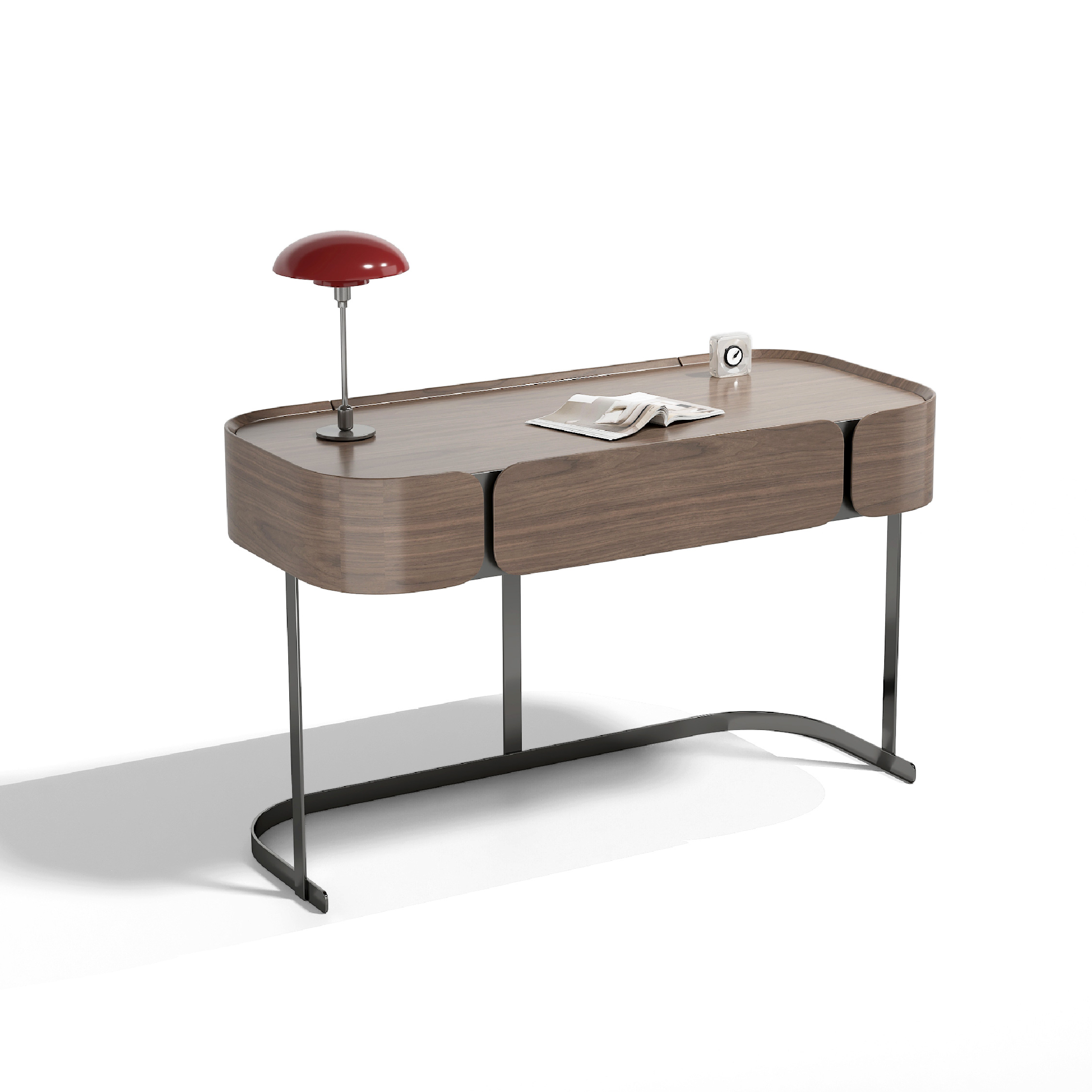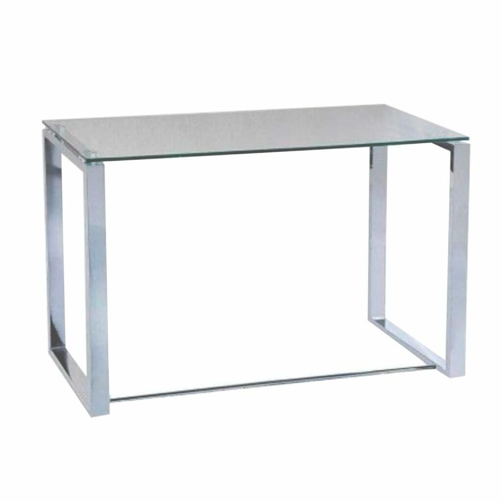 El escritorio Xylion tiene un diseño elegante y sencillo, con una tapa de vidrio y acabado en plata cromada, ideal para espacios modernos y prácticos.