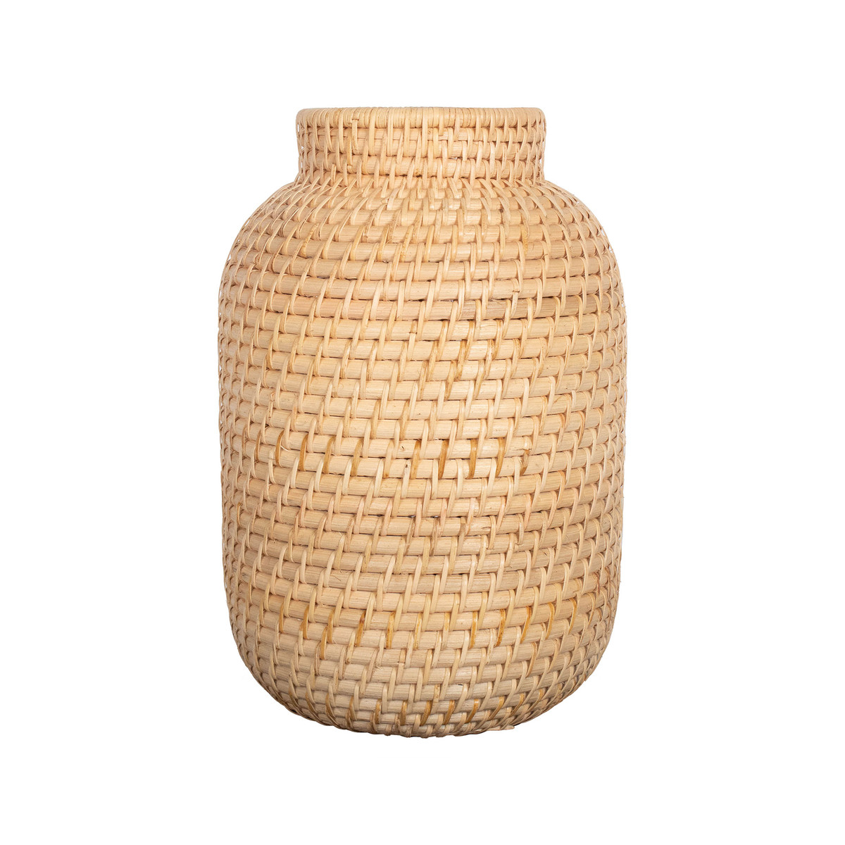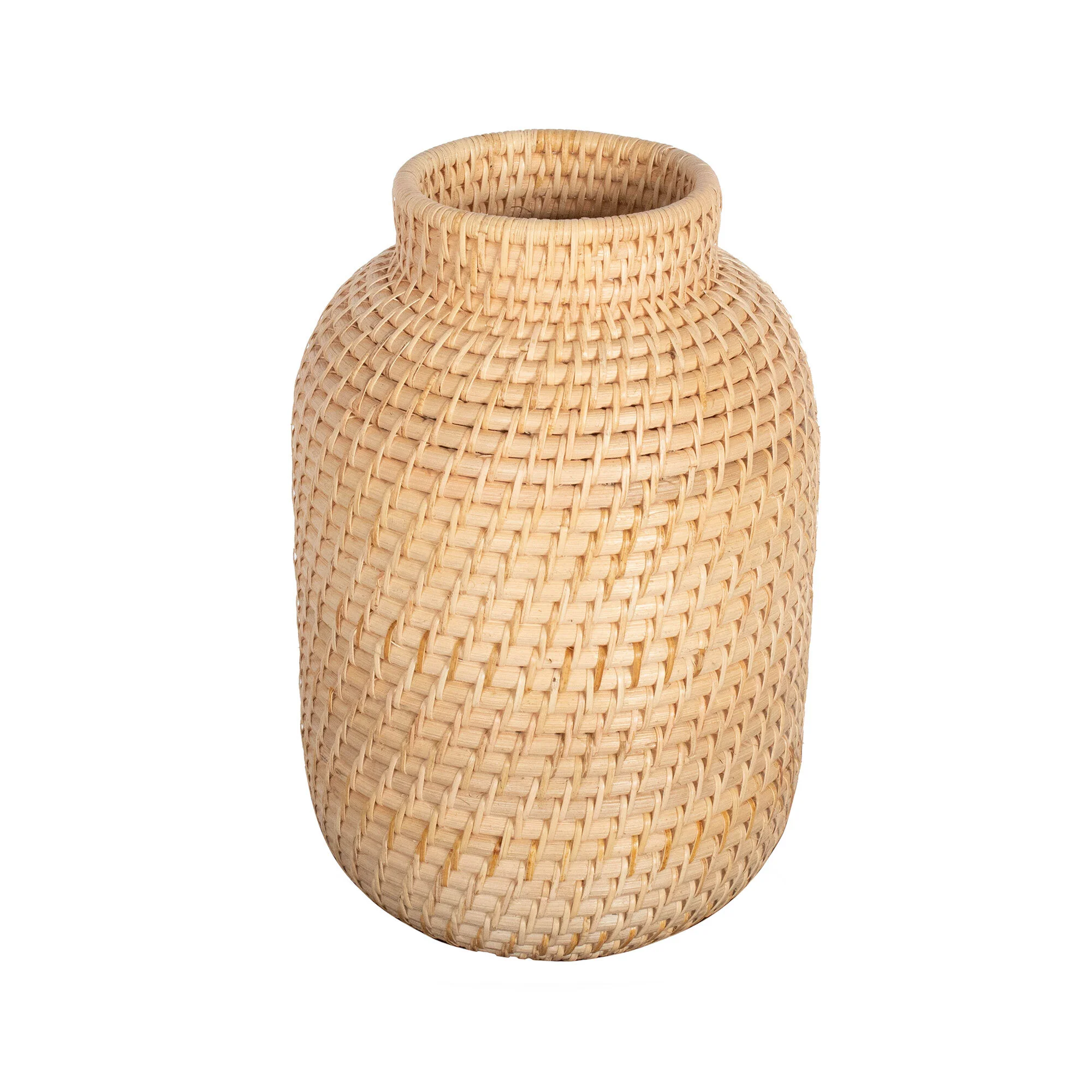 Jarrón cilíndrico de rattan con tejido artesanal, ideal para aportar un toque cálido y orgánico al hogar.