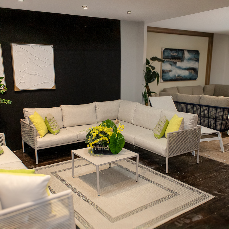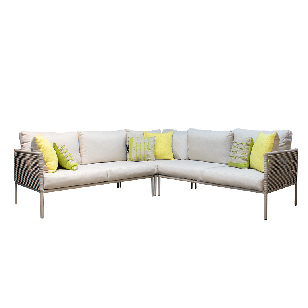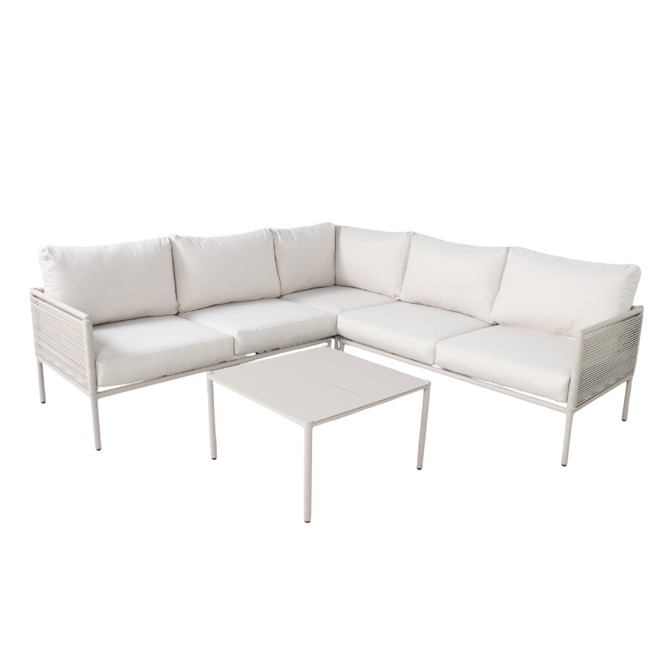 La estructura del sofá está fabricada en aluminio de alta calidad, recubierta con cuerda trenzada que aporta un toque moderno y fresco. Sus cojines acolchados ofrecen un confort superior, ideales para pasar largas tardes al aire libre. La mesa de centro minimalista, también en aluminio, complementa perfectamente el conjunto, manteniendo una línea visual limpia y elegante.
