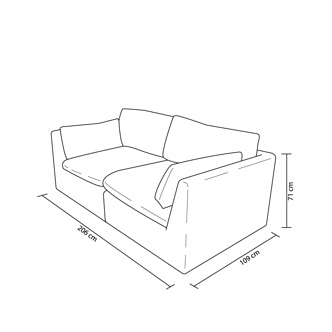 Diseñado con un módulo final derecho y uno final izquierdo, este sofá se puede usar como pieza única o formar parte de una composición modular más amplia. Sus cojines anchos, de gran densidad, están pensados para ofrecer una experiencia de descanso superior, ideal para relajarse en cualquier momento del día.