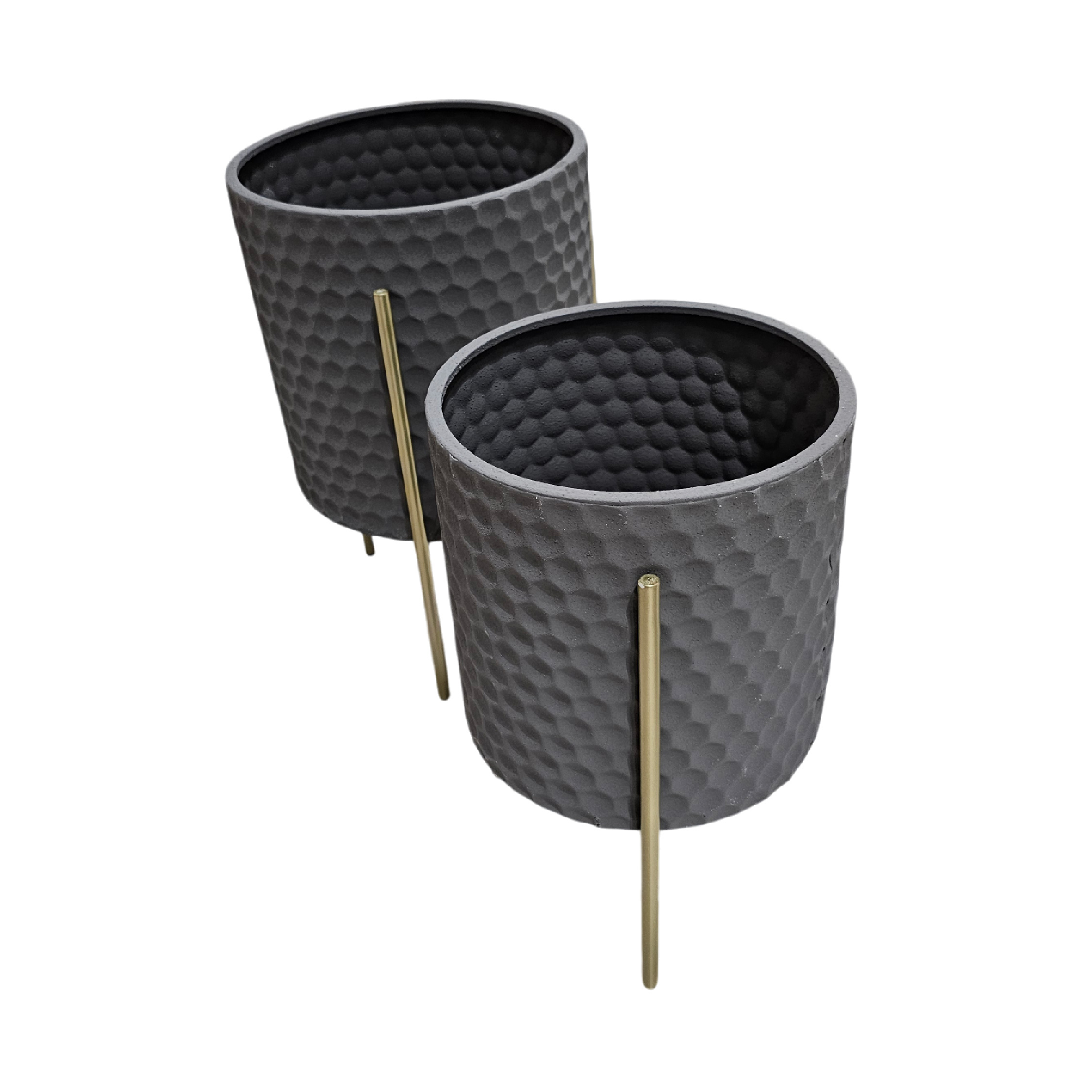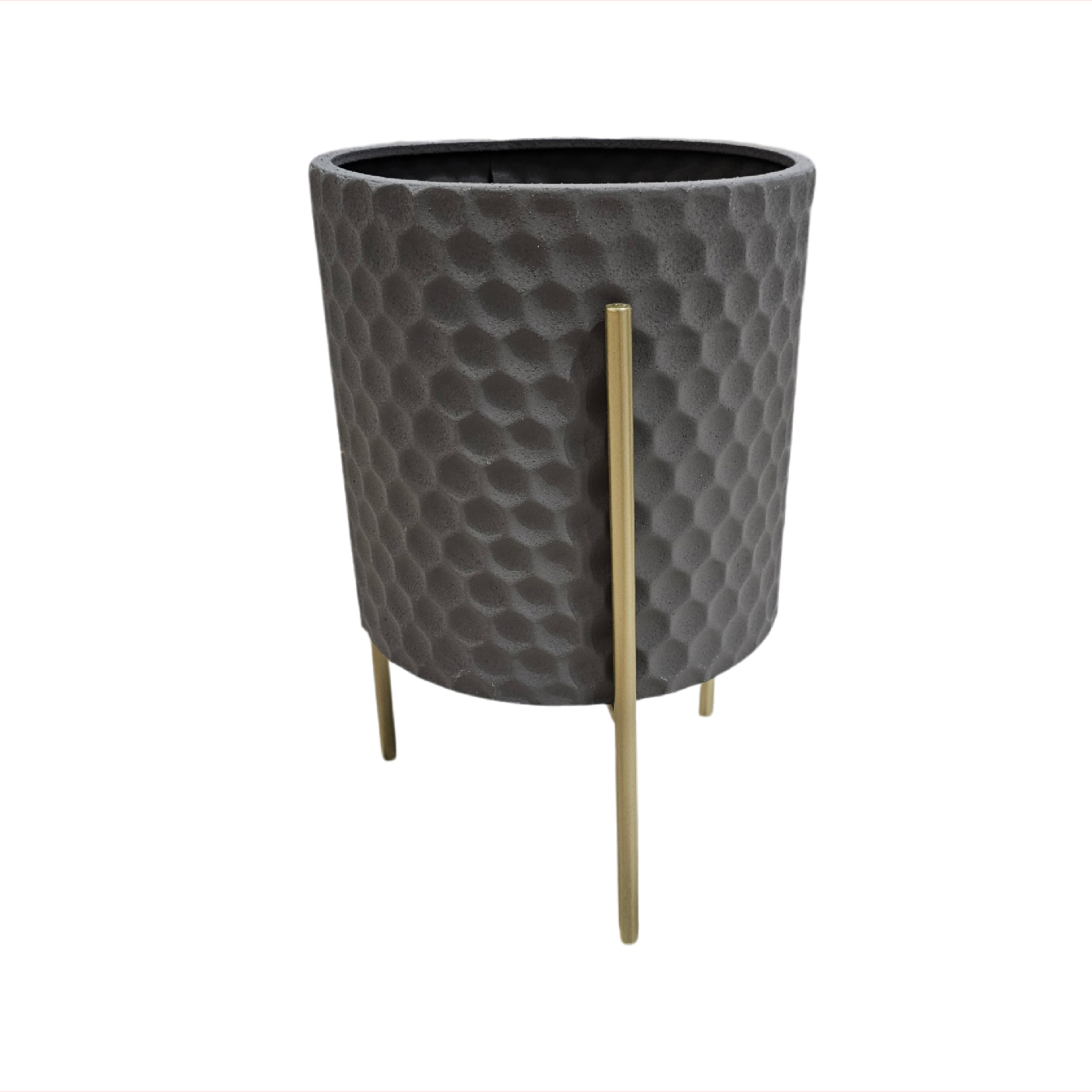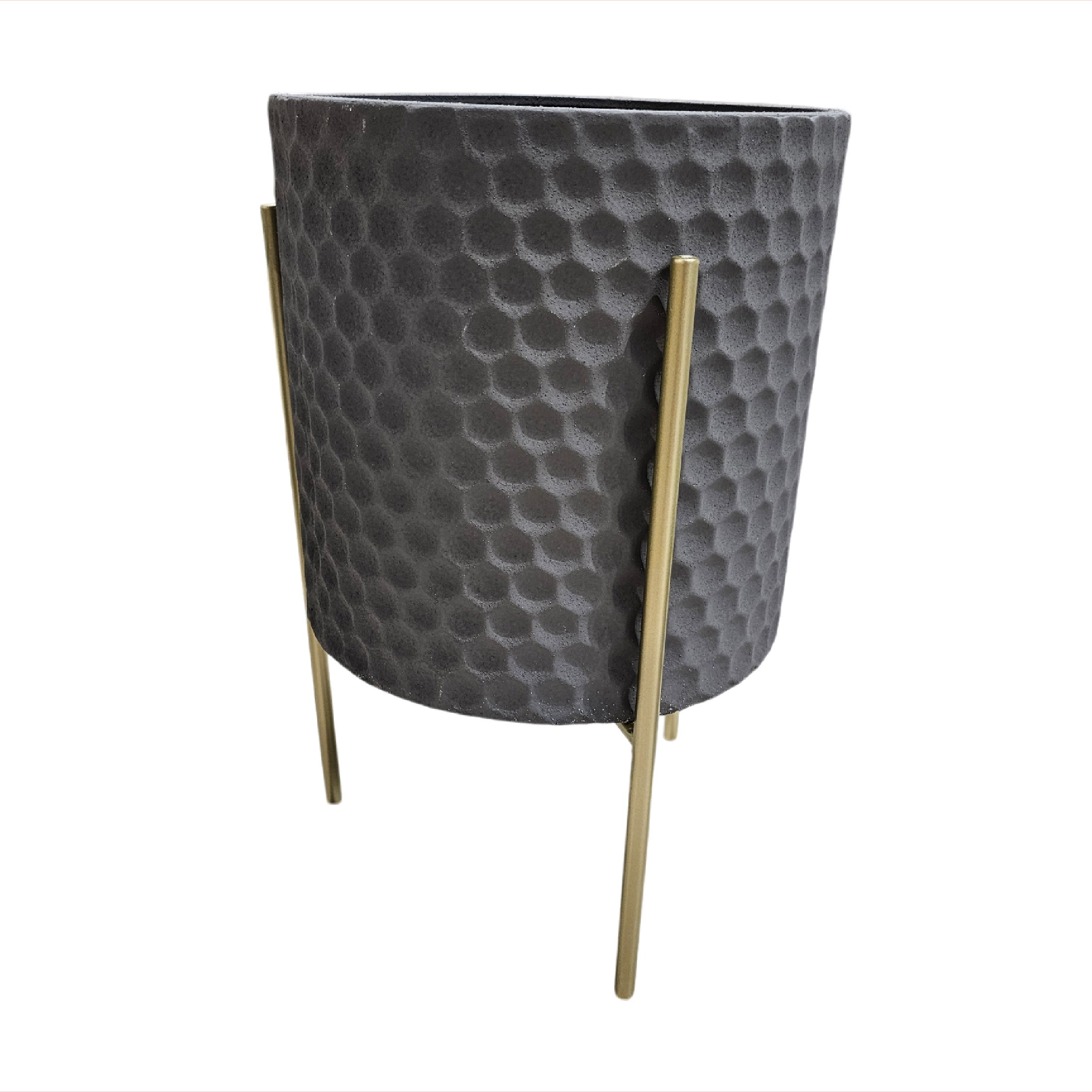 Maceta en metal preformado y pintado, soporte en metal color dorado.