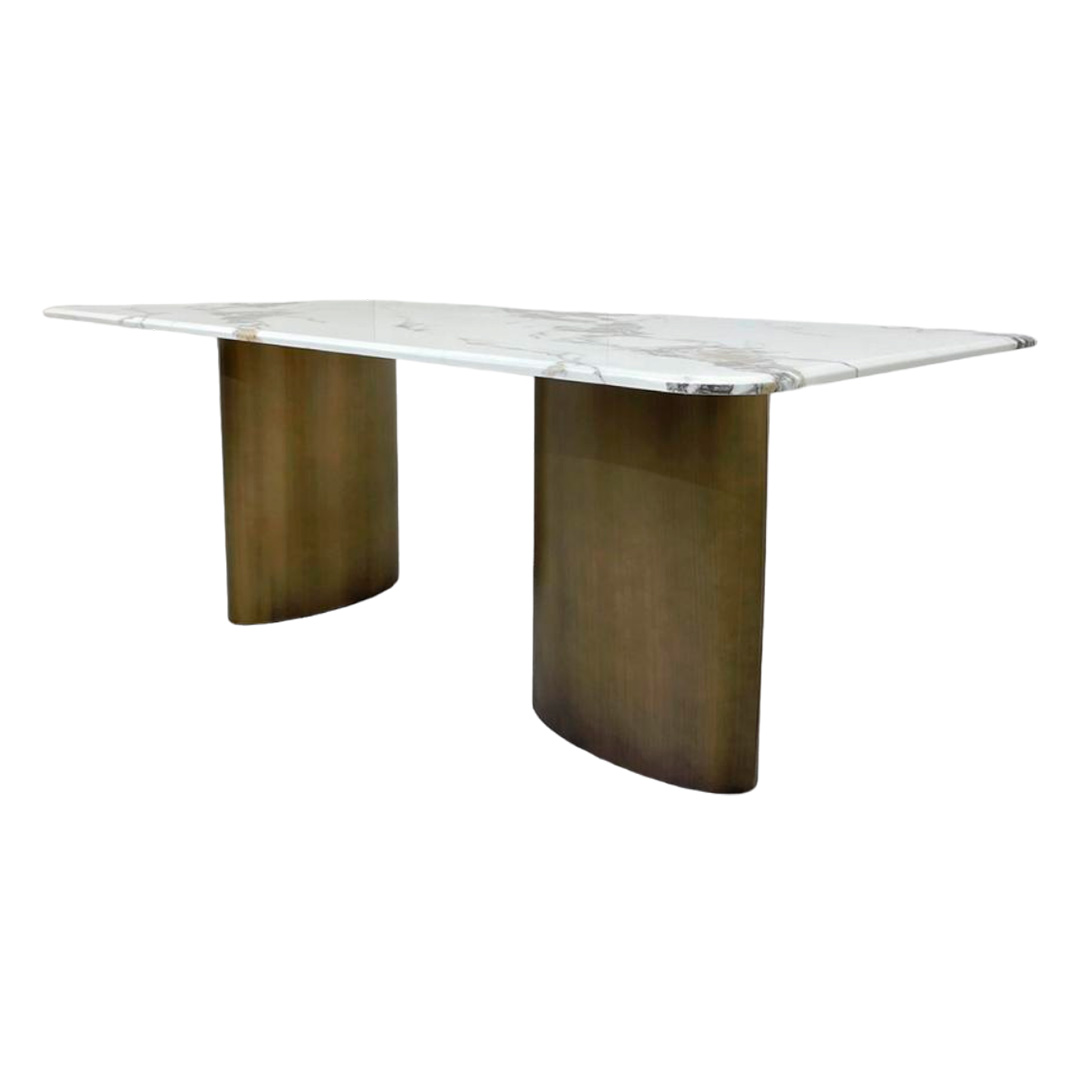 Diseño rectangular con sobre de mármol y patas en bronce, ideal para espacios modernos y elegantes.