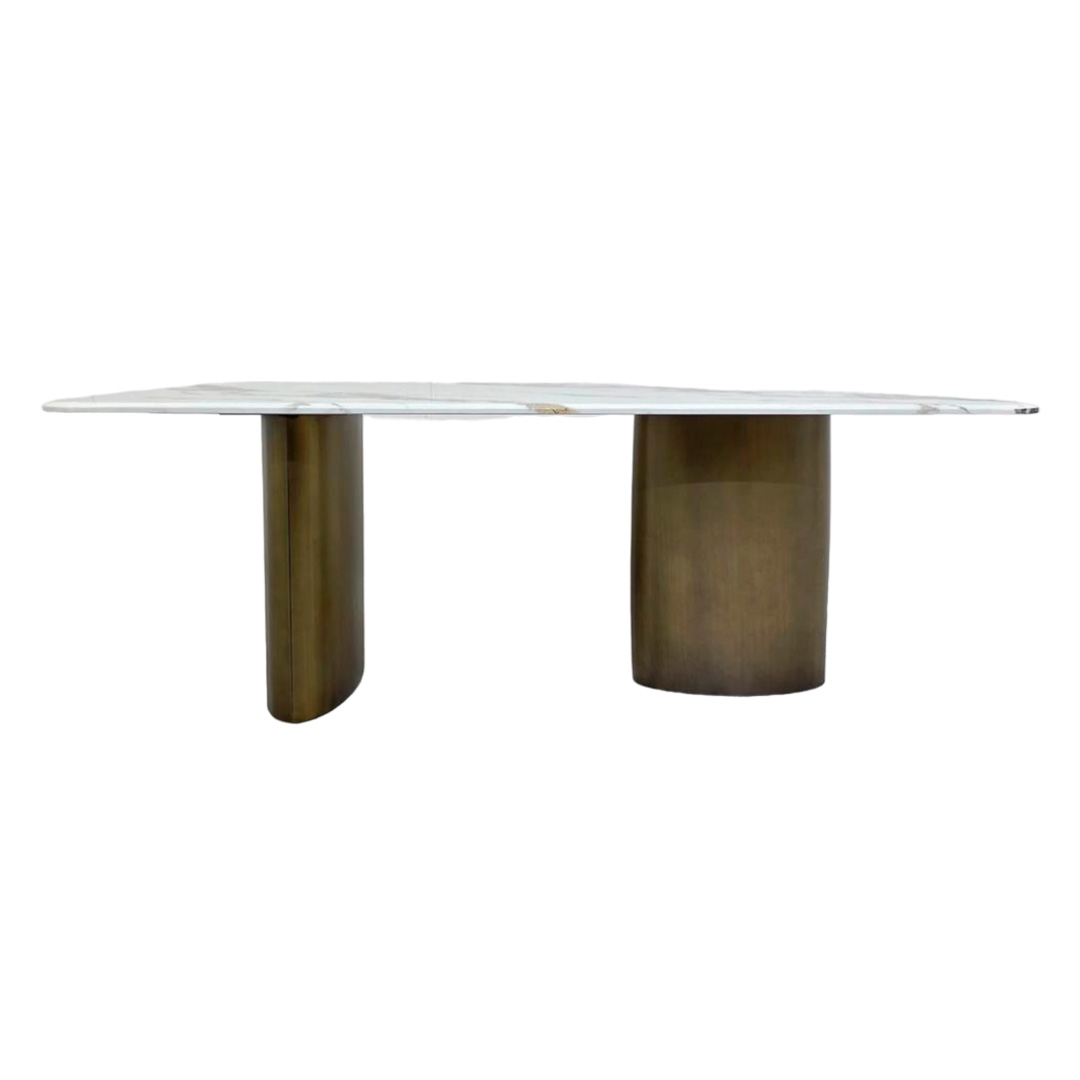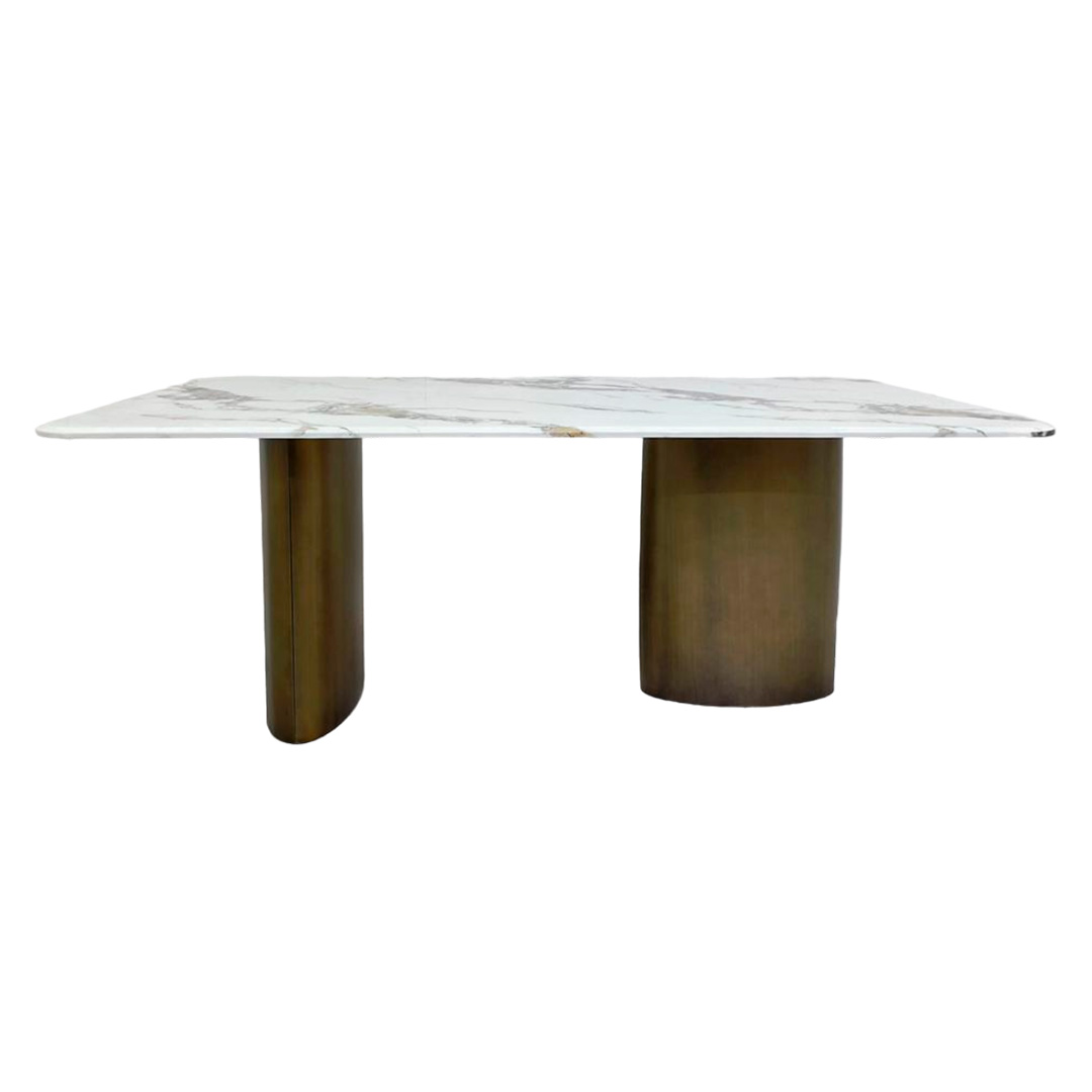La Mesa Comedor Mikoto tiene un estilo moderno y cuenta con una elegante forma rectangular. Su sobre de mármol aporta sofisticación y durabilidad, mientras que sus patas con acabado en bronce le dan un toque distintivo y atractivo.