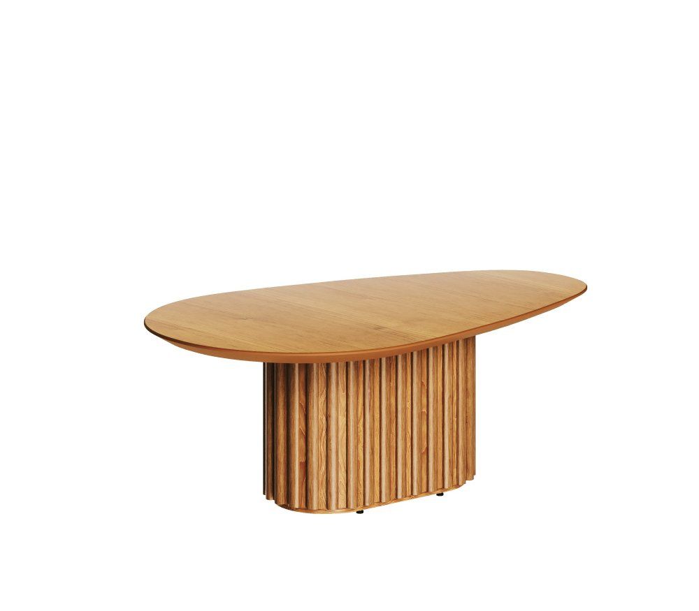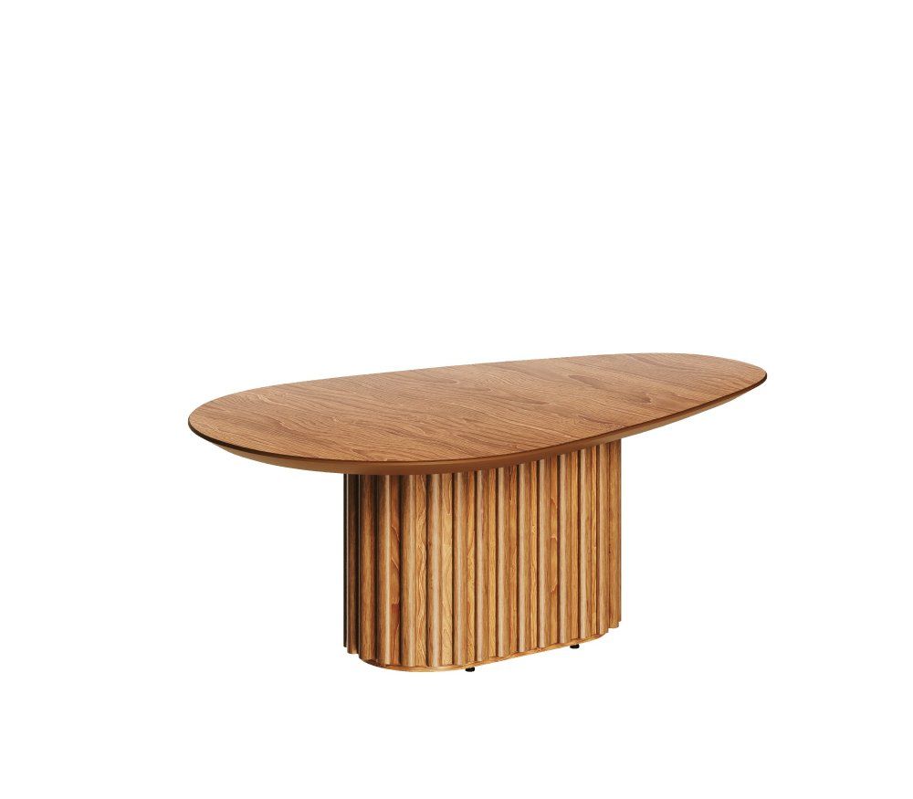 Esta mesa de centro integra estilos clásicos y en tendencia. Su sobre cuenta con una forma original que se asimila a una avellana, mientras su soporte la complementa con forma redonda y relieve en su base. Tiene una forma orgánica, adecuada para espacios sutiles y agradables.