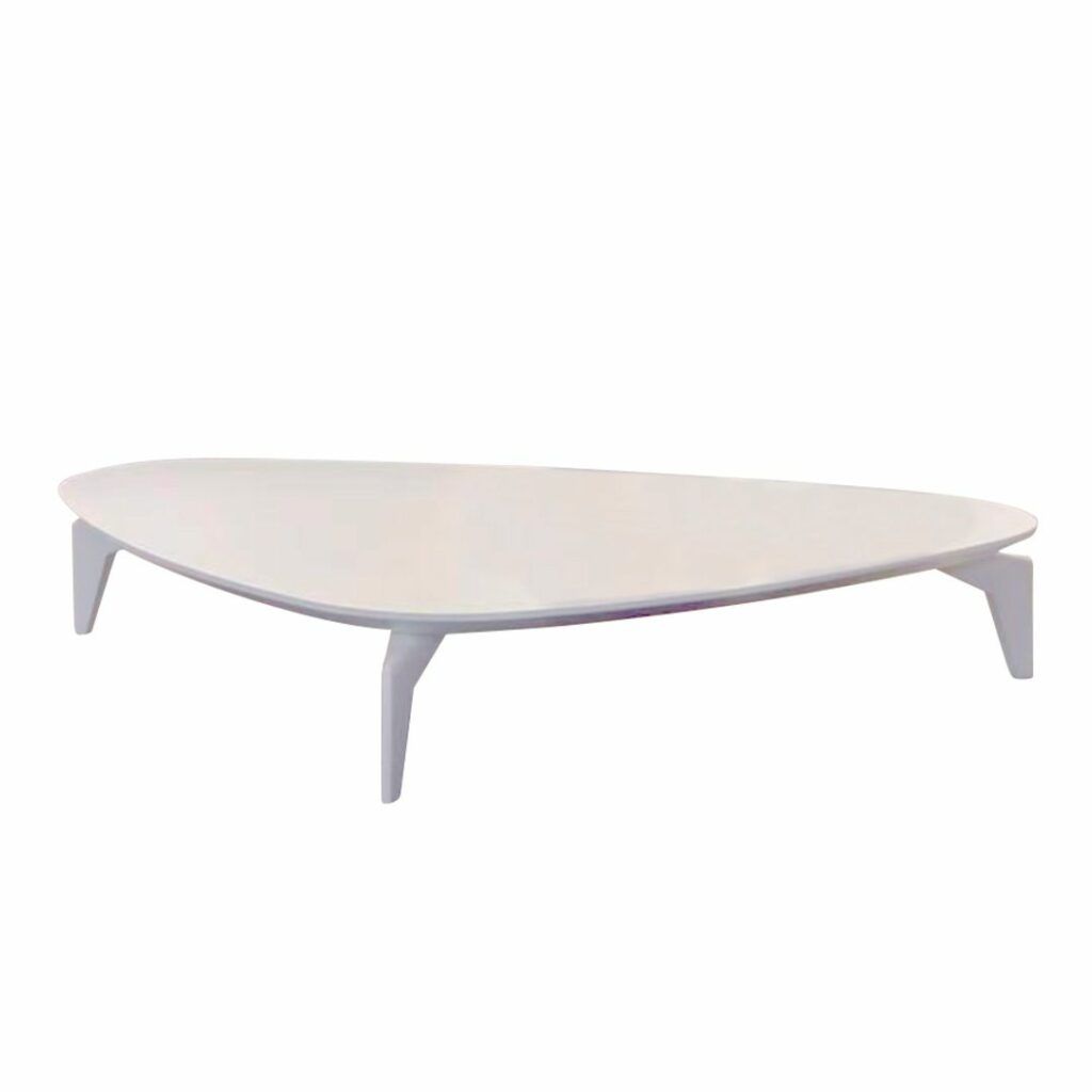Mesa de centro de estilo minimalista triangular, con acabados en mármol y estructura en metal, resistente y funcional. La forma triangular suavizada agrega elegancia.