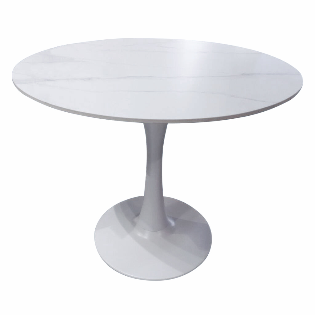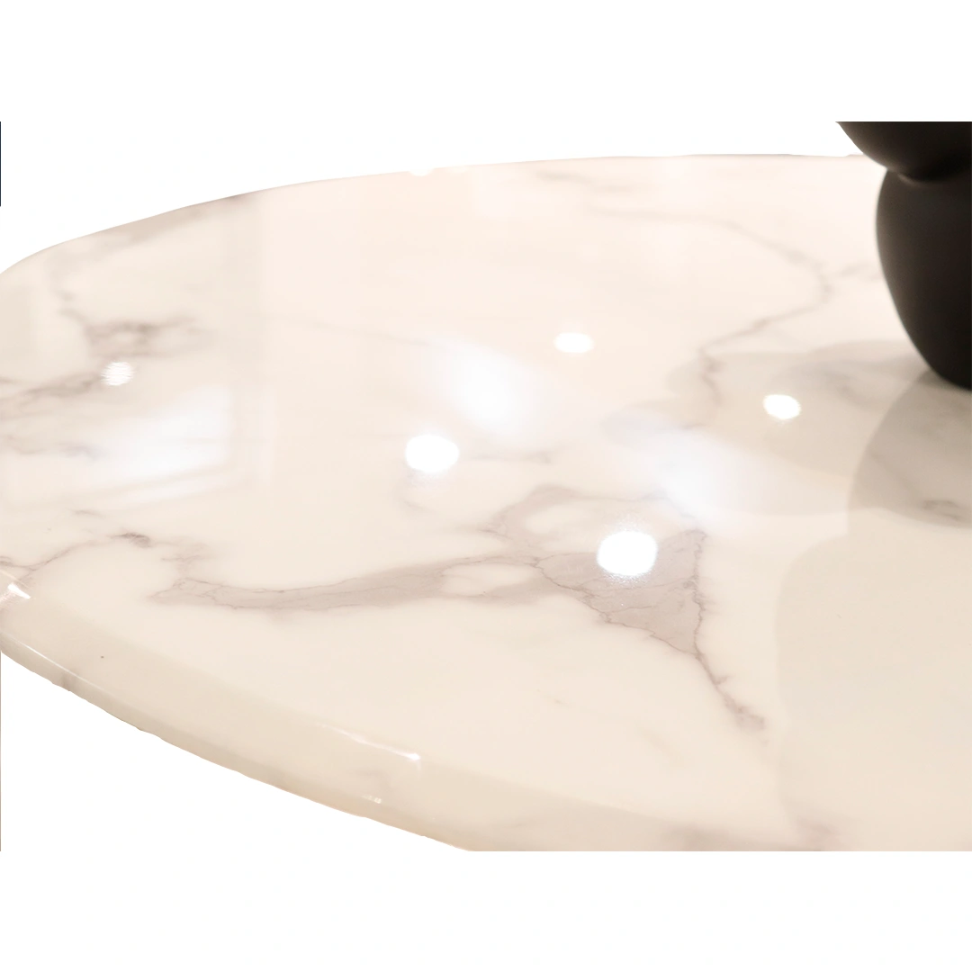El sobre redondo en mármol Snow White de 12 mm aporta una textura elegante y atemporal que realza cualquier ambiente, mientras que la base de acero con pintura electrostática —disponible en acabado blanco o negro— garantiza estabilidad, durabilidad y un look contemporáneo impecable.