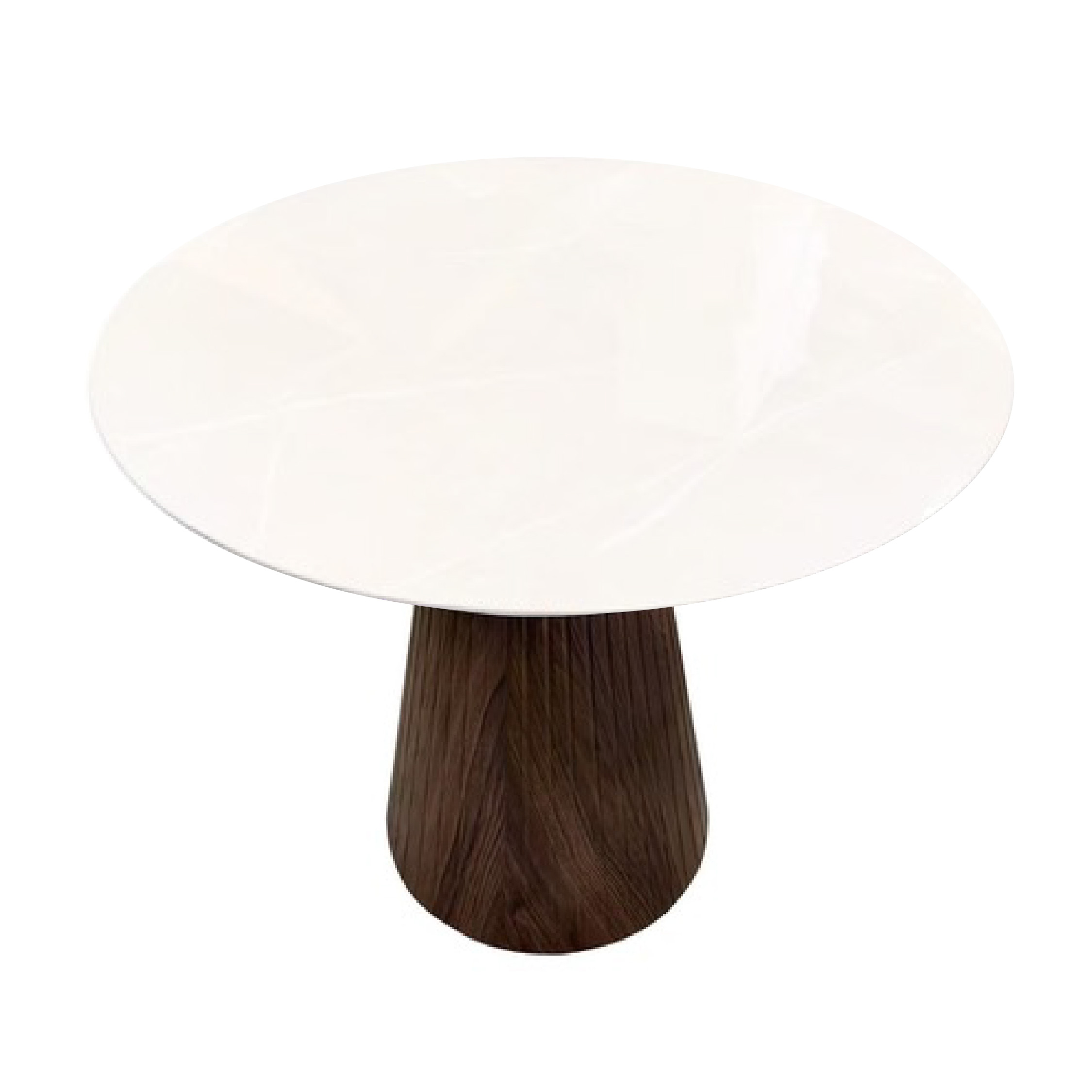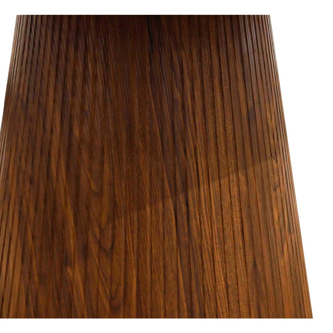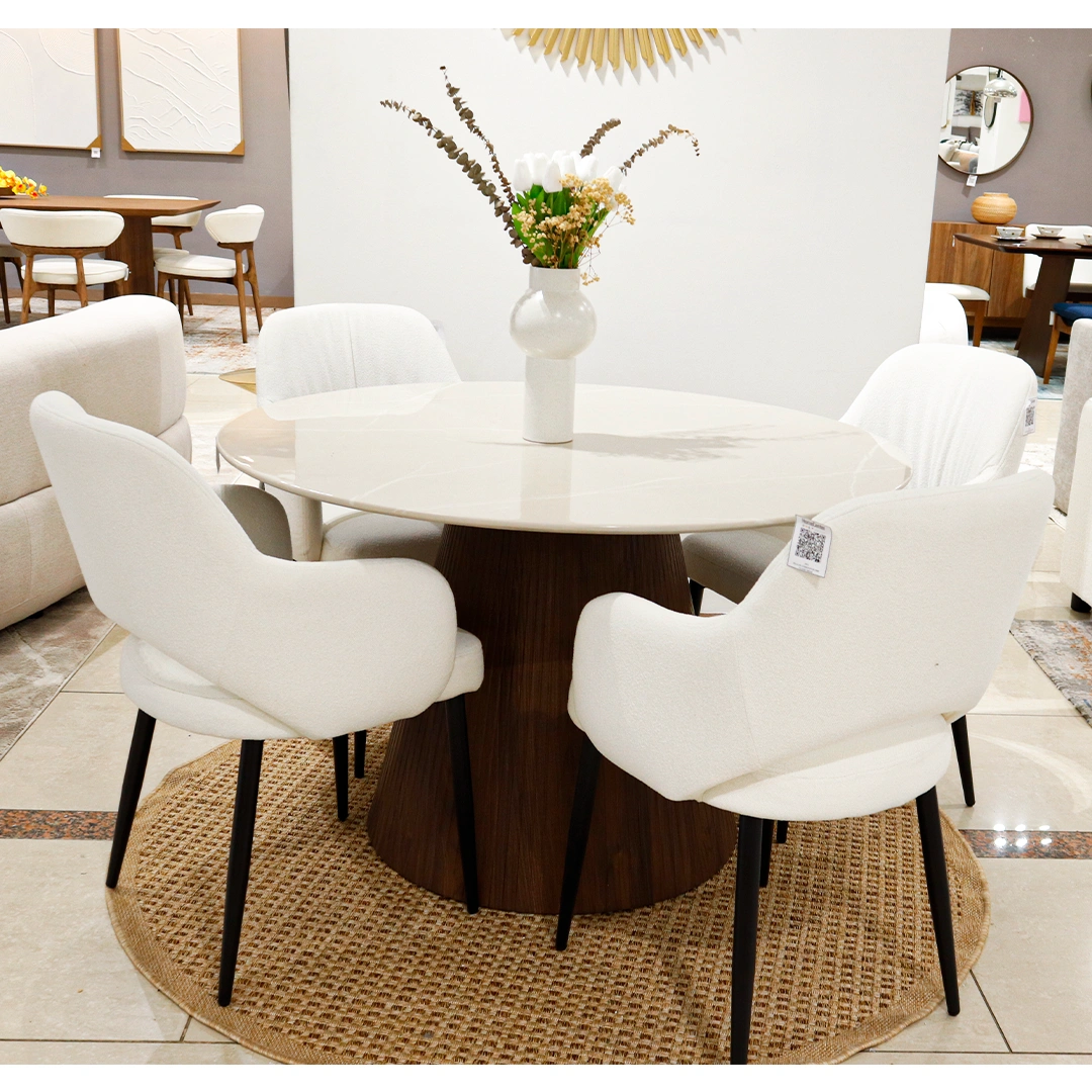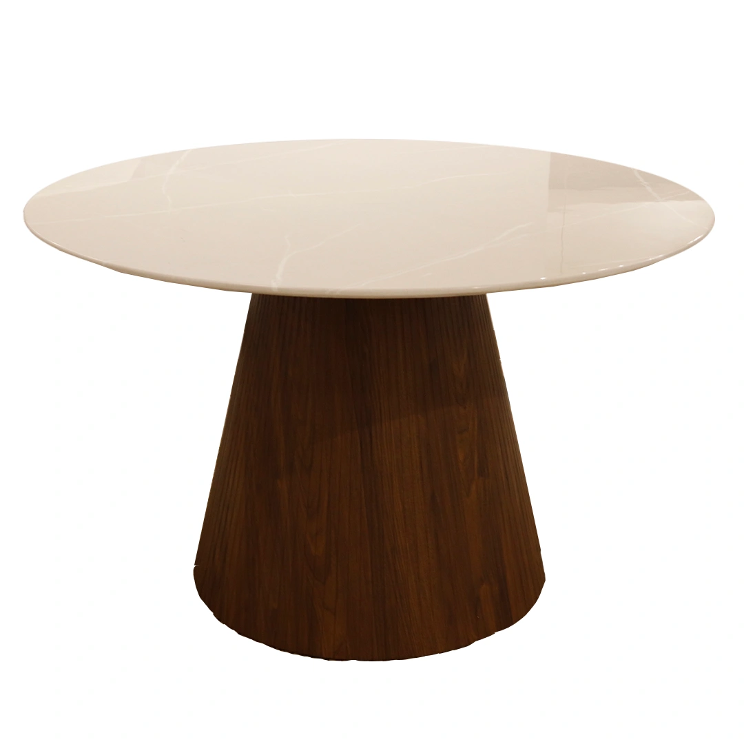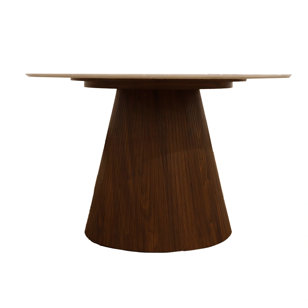 La Mesa de Comedor Firul fusiona elegancia moderna y calidez natural en una pieza visualmente impactante. Su sobre circular de mármol industrial blanco con vetas sutiles refleja sofisticación, mientras que la base cónica, fabricada en melamina tono walnut con acabado acanalado, añade textura y carácter al diseño. Esta mesa es ideal para comedores que buscan destacar con una estética contemporánea sin perder funcionalidad. Gracias a su forma redonda y proporciones generosas, ofrece fluidez y comodidad para reuniones íntimas o espacios sociales.