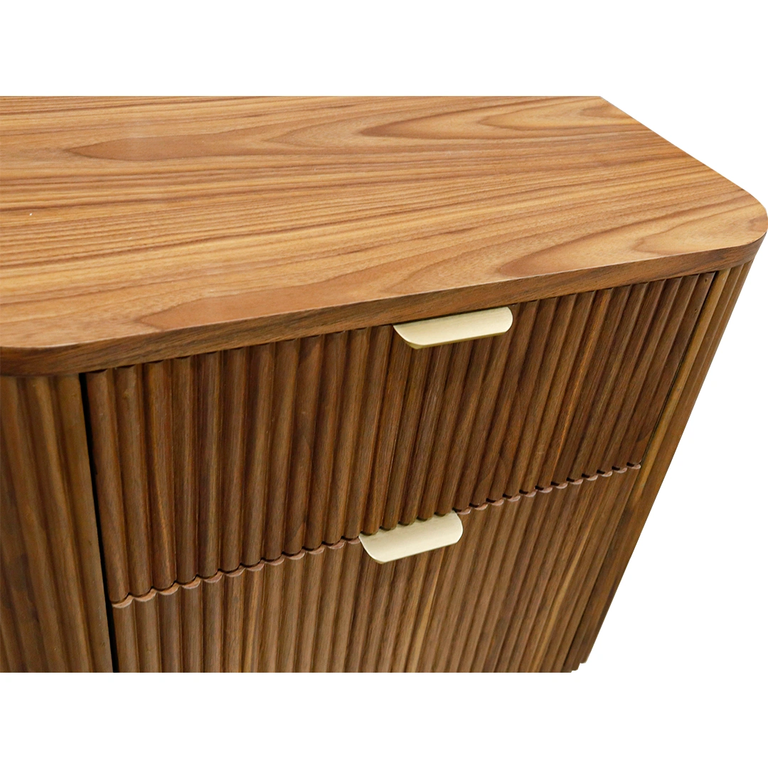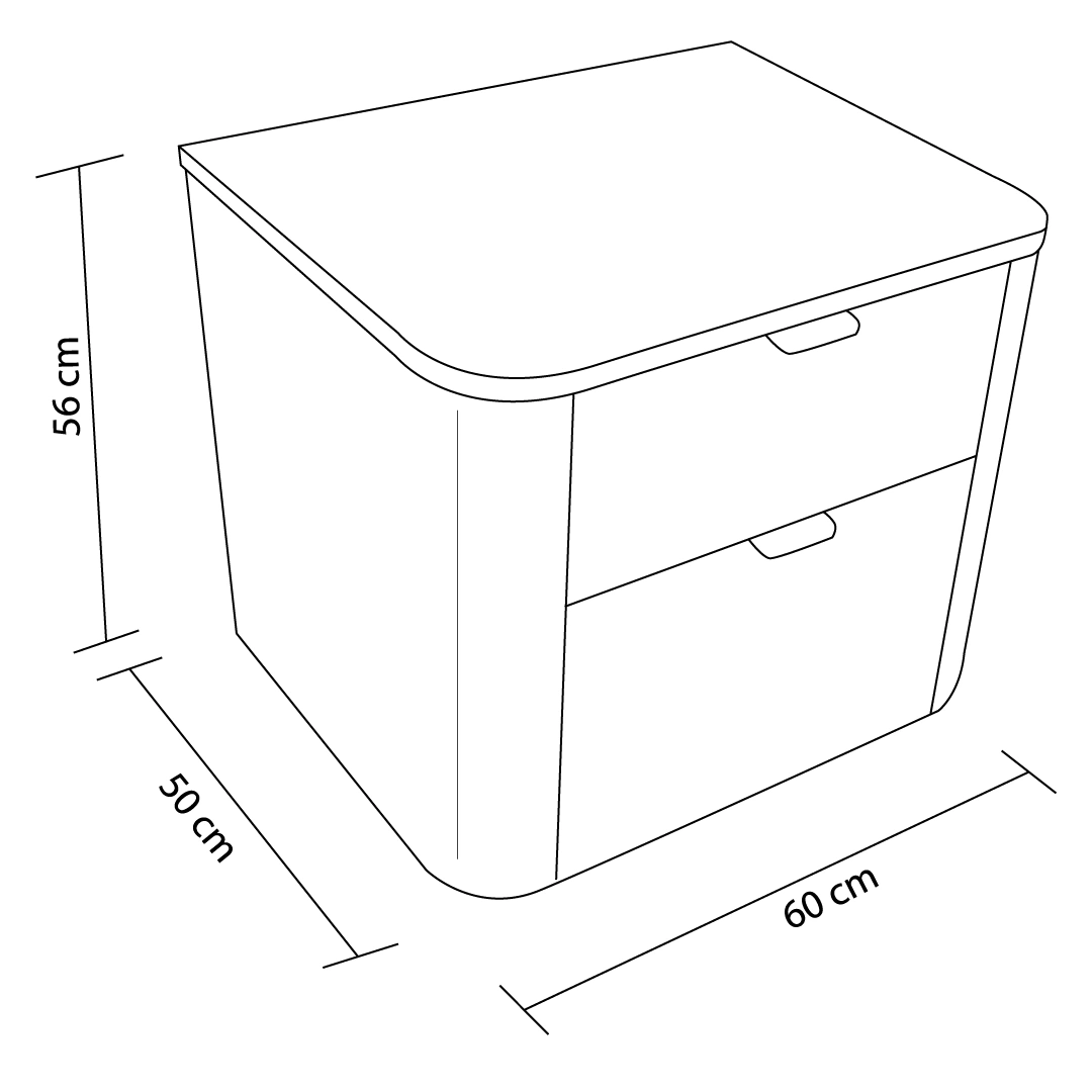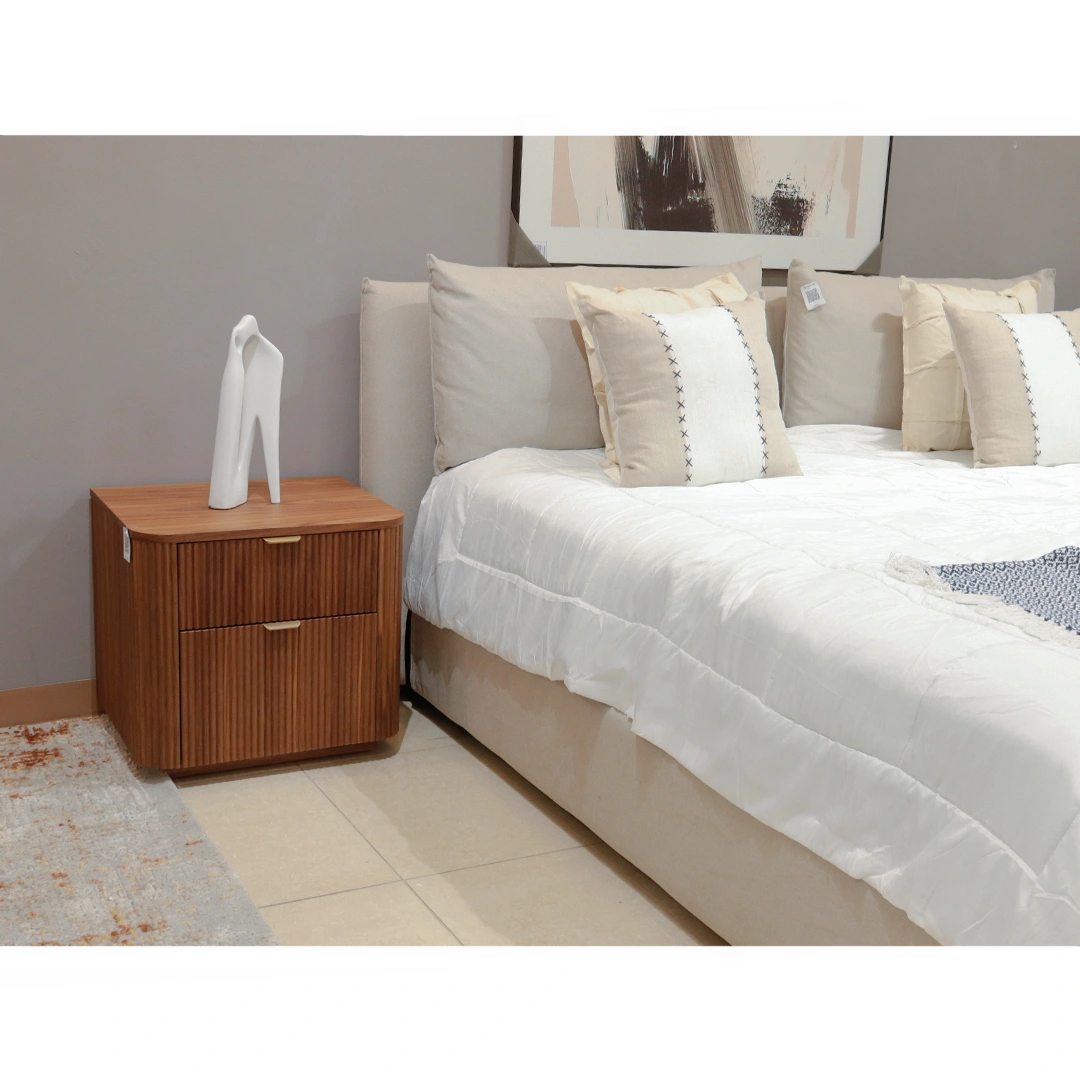 Con un diseño de líneas suaves y bordes redondeados, esta mesa de noche incorpora dos gavetas amplias con herrajes metálicos dorados que agregan un sutil toque de lujo. Ideal para guardar libros, cargadores, o artículos personales, manteniendo tu espacio ordenado y estilizado.