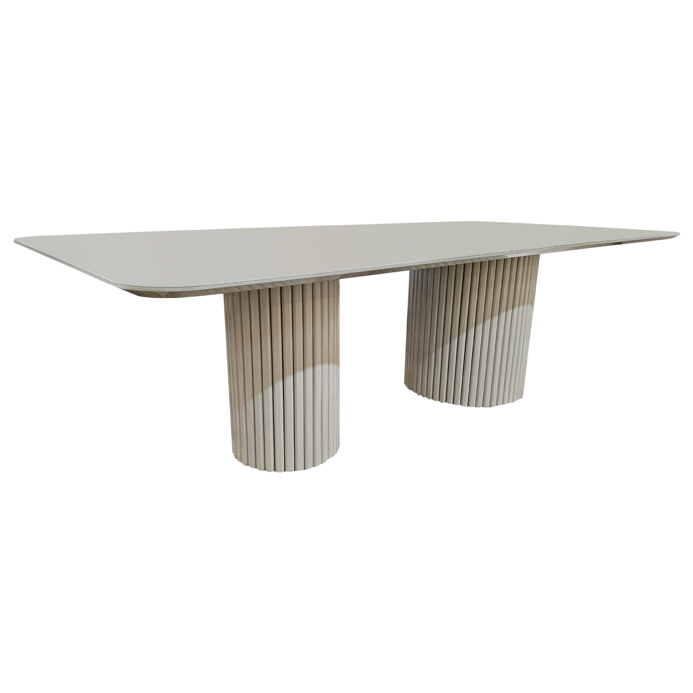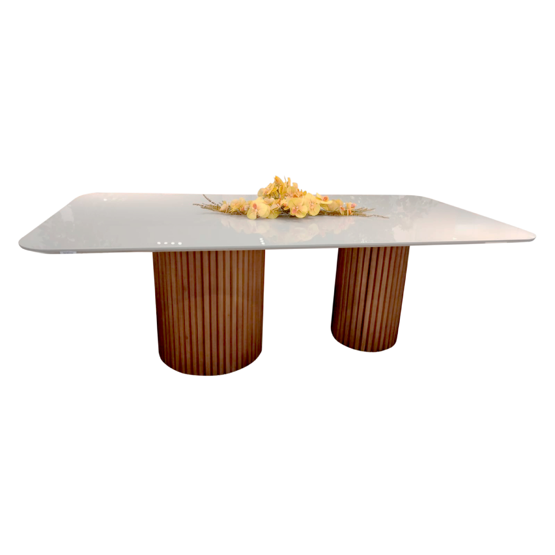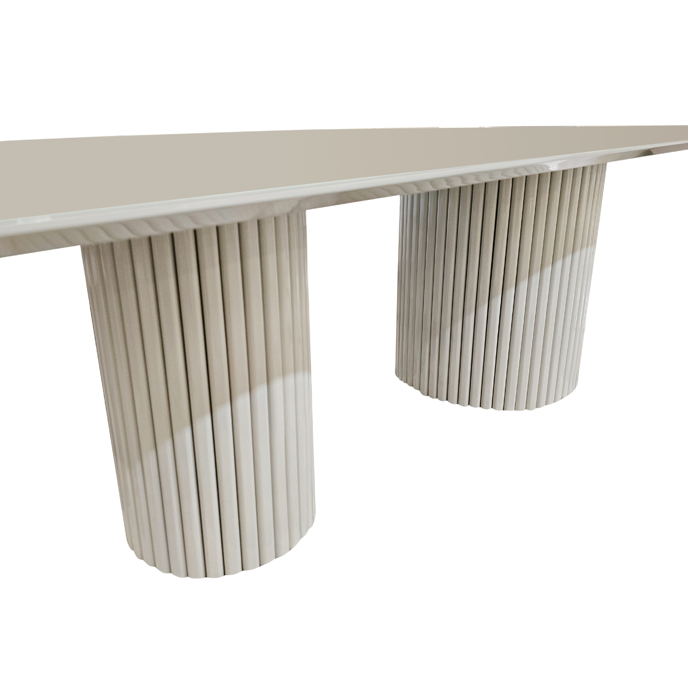 La Mesa Rectangular Grega es una pieza de diseño contemporáneo que destaca por su refinada presencia y sus bases cilíndricas ripiadas, que le otorgan un carácter escultórico único. Ideal para comedores sofisticados que buscan un equilibrio entre elegancia, modernidad y funcionalidad.
