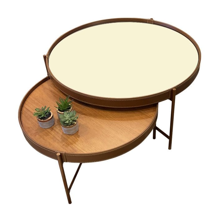 Mesa redonda con revestimiento de material sintético de alta calidad.
