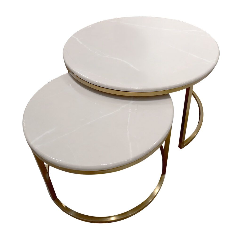 Elegantes mesas con estructura en acabado Golden y tapa en Mármol que se puede entrelazar una con la otra por su forma y diferente altura.