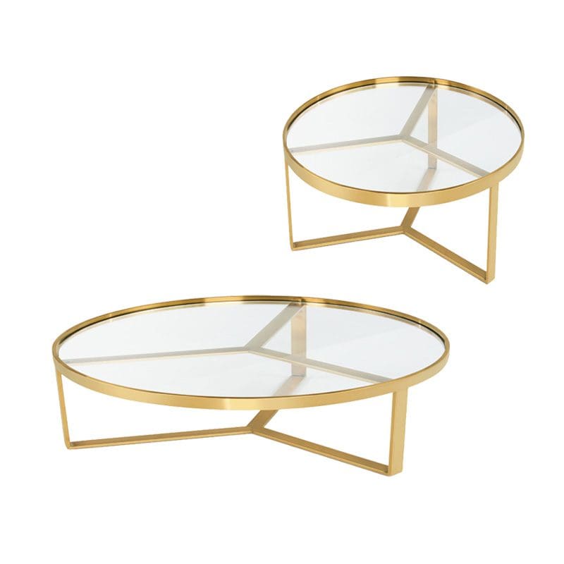 Singulares mesas de centro, en acabado Golden Brush y vidrio transparente. Muy prácticas y elegantes.