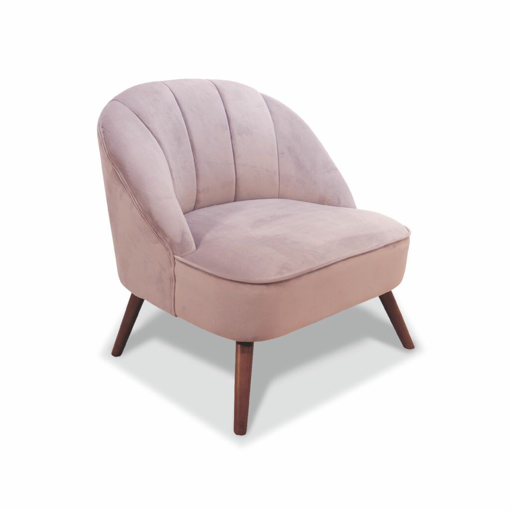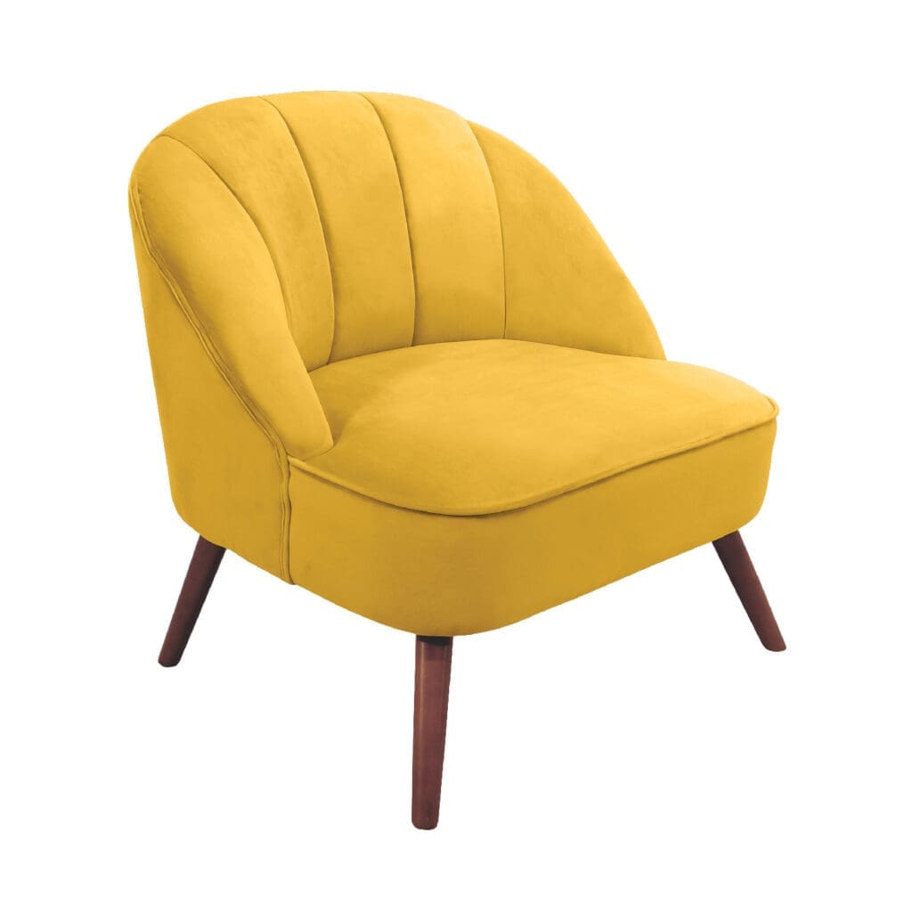 Poltrona en velvet con diferentes colores y patas oscuras en madera.