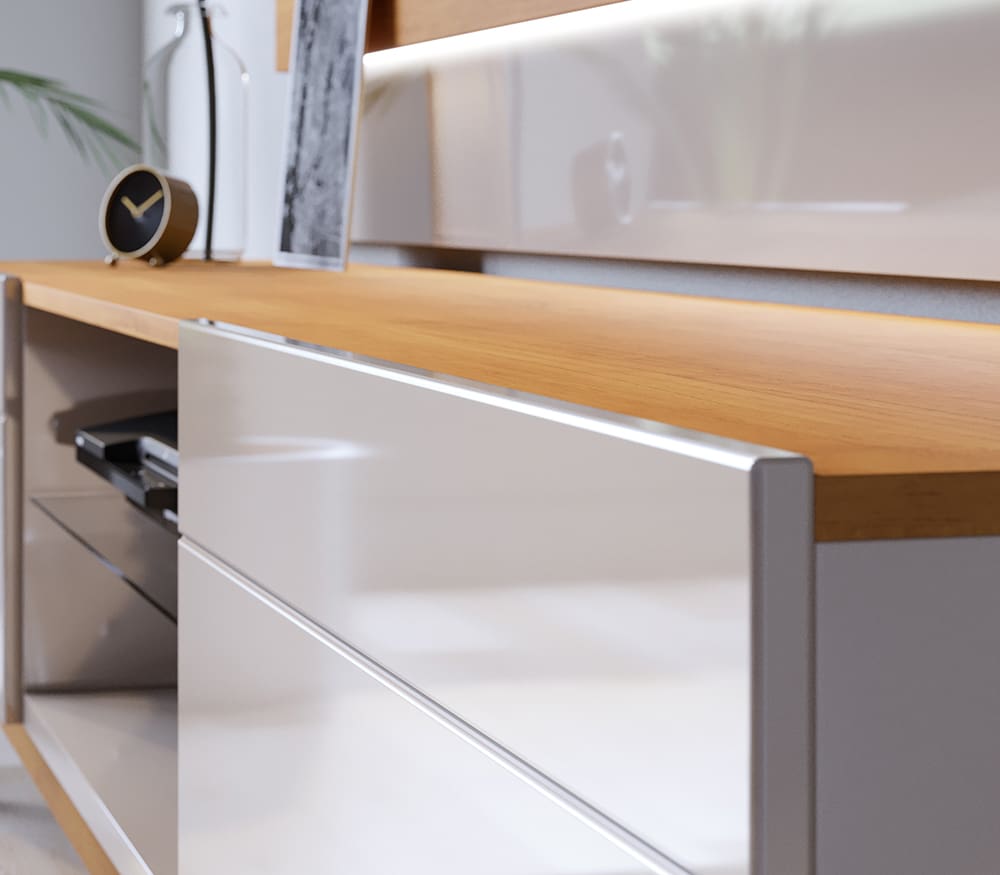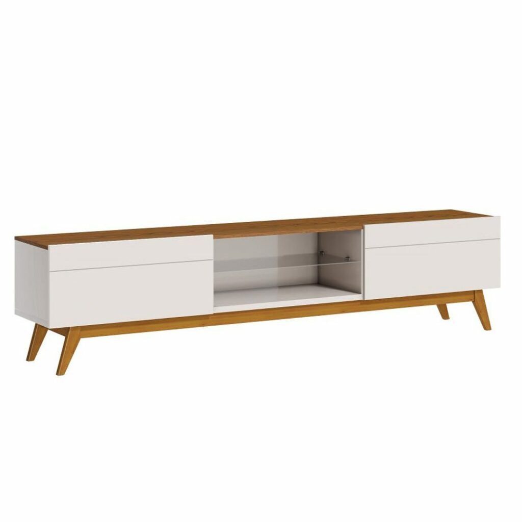 Cuenta con dos gavetas laterales de gran capacidad, perfectas para guardar controles, cables, o accesorios multimedia, y una repisa central abierta ideal para consolas de videojuegos, routers o equipos de sonido. Su base de madera natural con patas anguladas y acabado superior en tono cálido aportan un aire escandinavo contemporáneo.