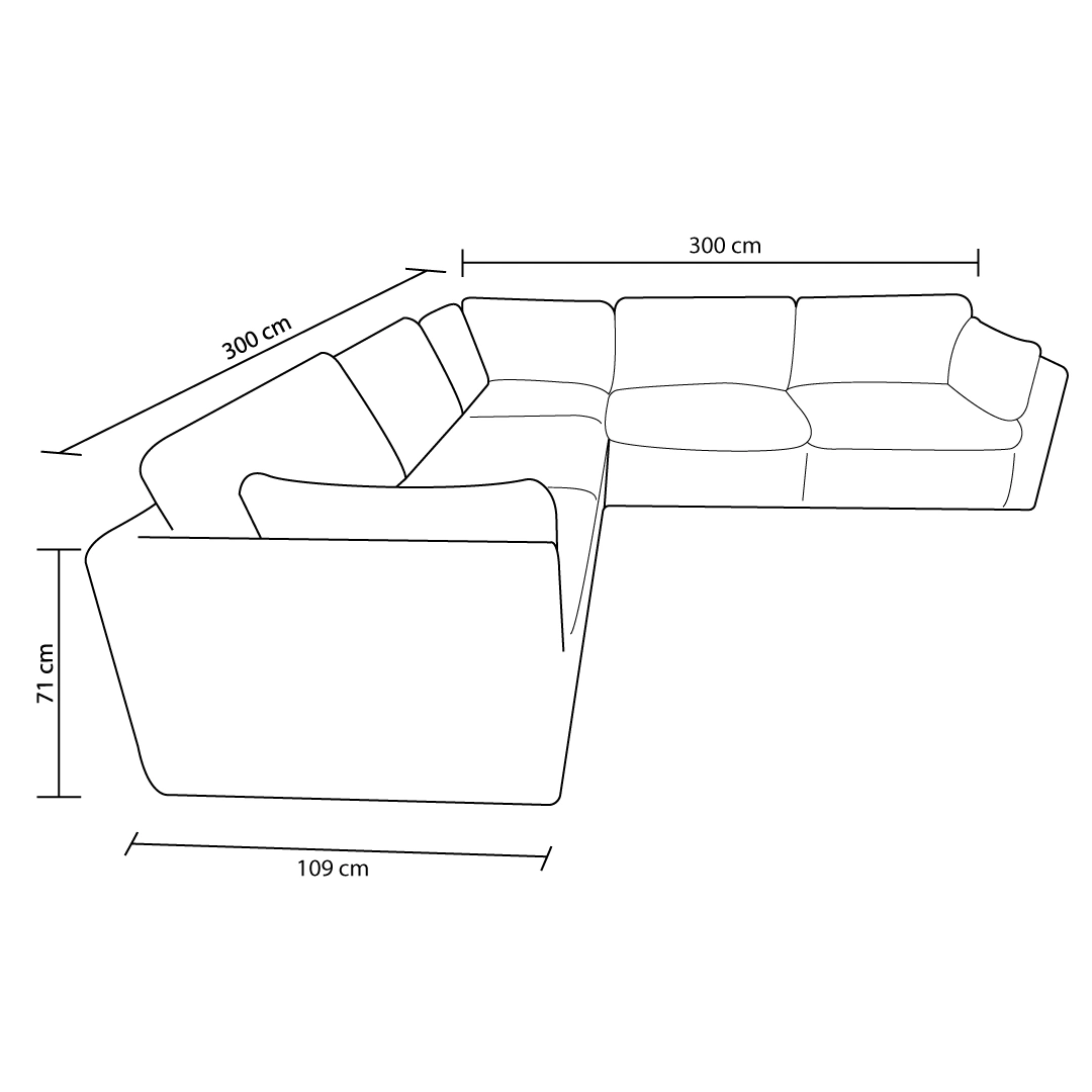 Sus dimensiones aproximadas de 3 metros de largo, 109 cm de ancho y 71 cm de alto lo convierten en una pieza robusta, ideal para quienes buscan un sofá moderno, amplio y con sensación de hotel 5 estrellas en casa. Ya sea para recibir visitas, leer o ver tus series favoritas, el Olaya será el corazón de tu hogar.