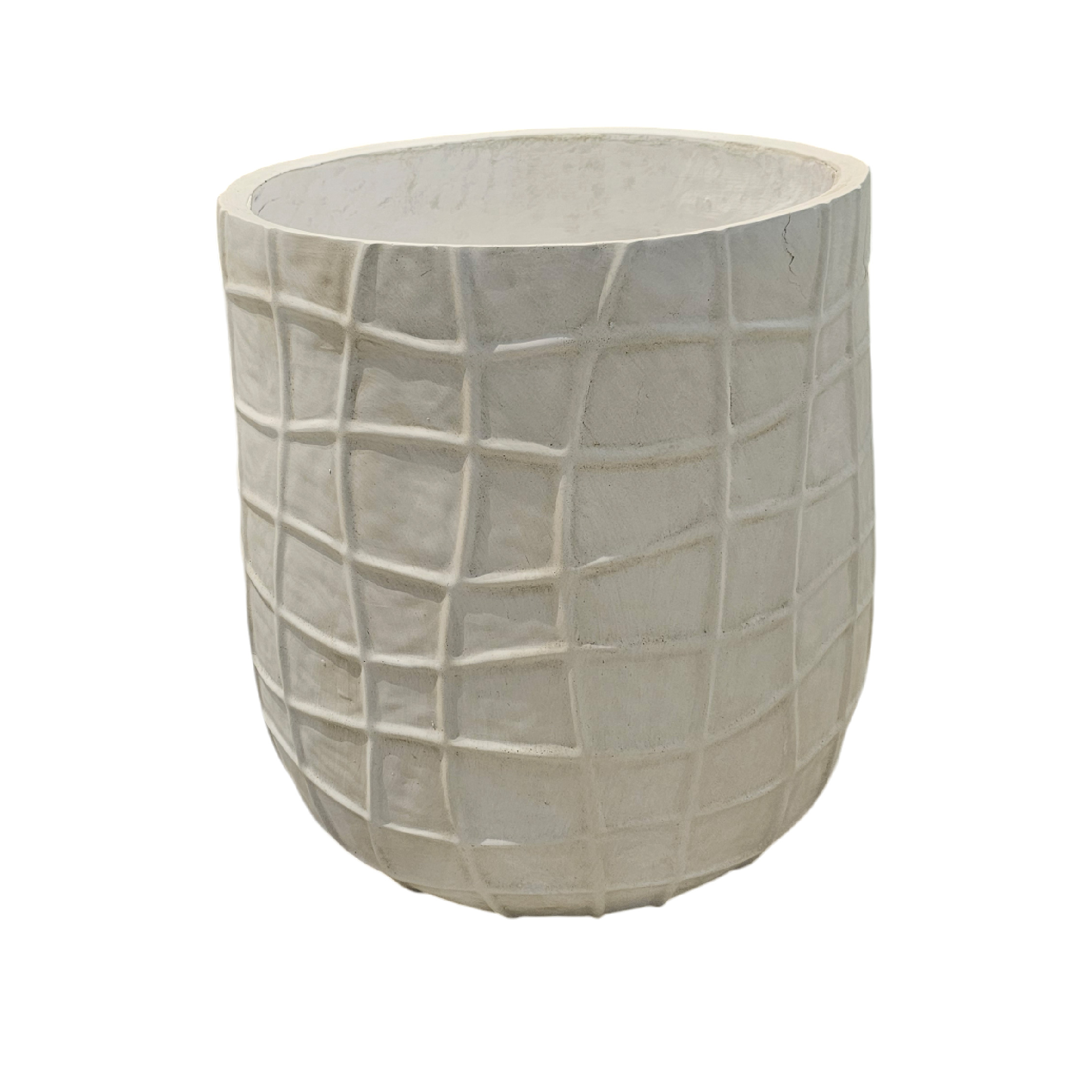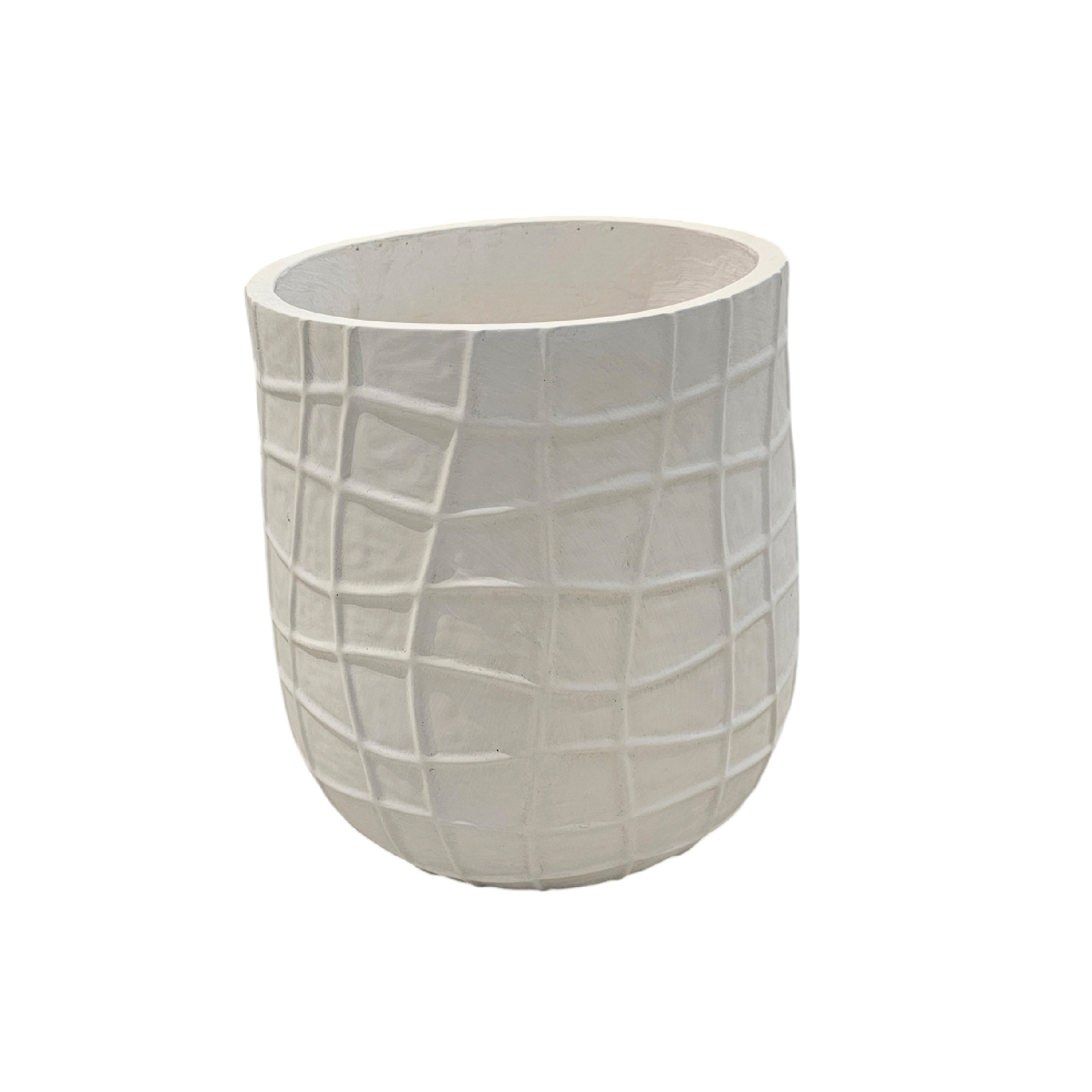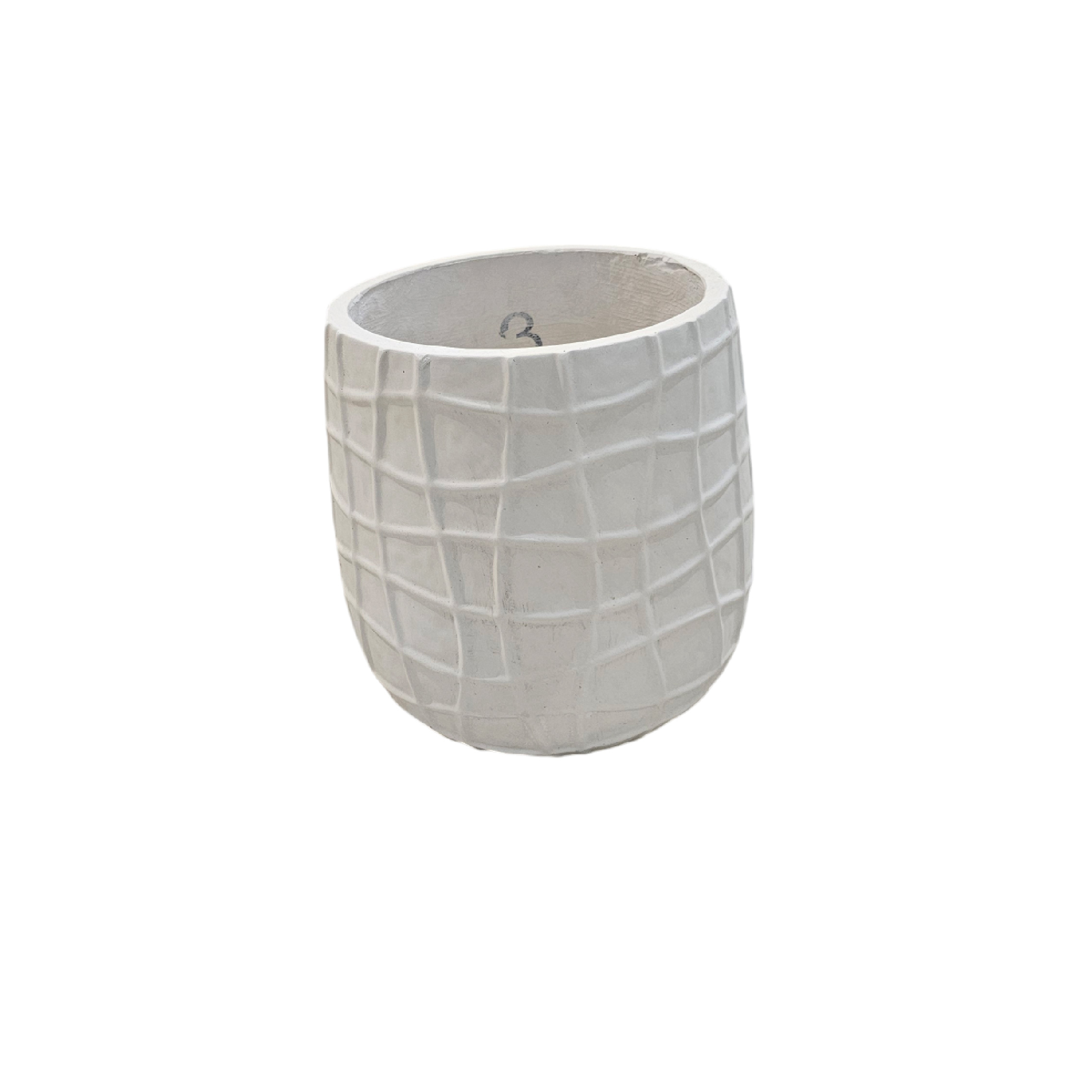Macetas hechas en resina blanco con diseño en relieve, ideales para unas hermosas plantas en tu hogar.