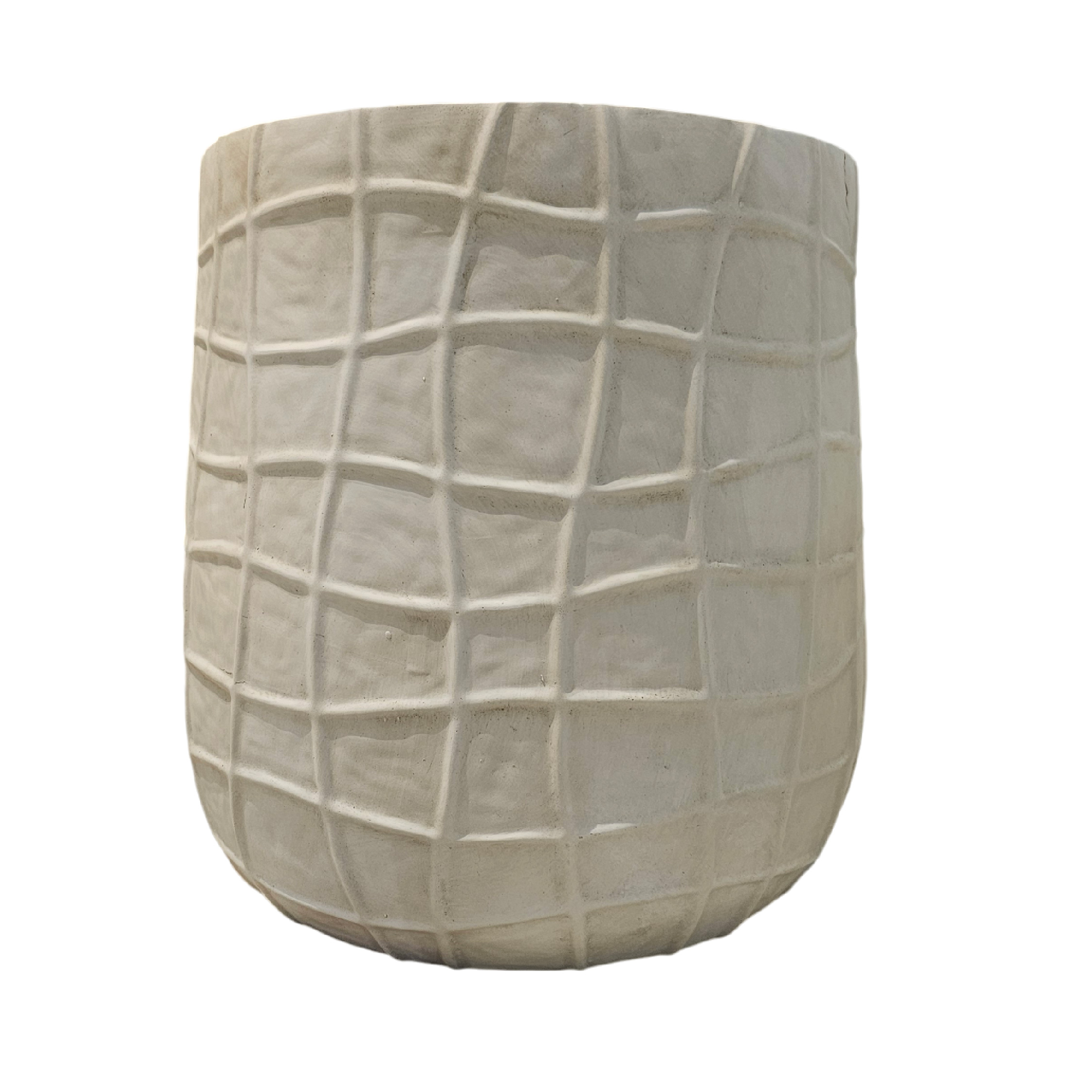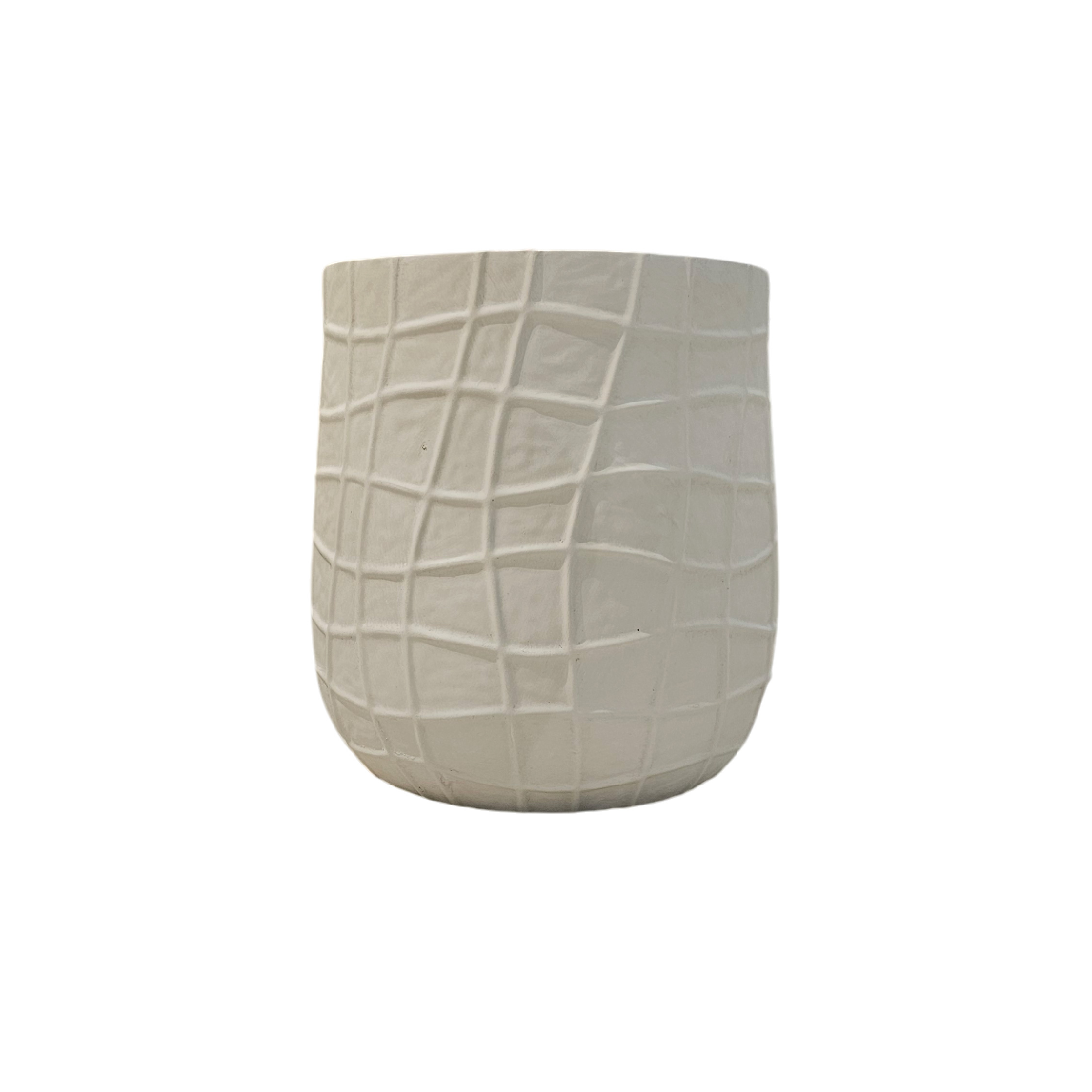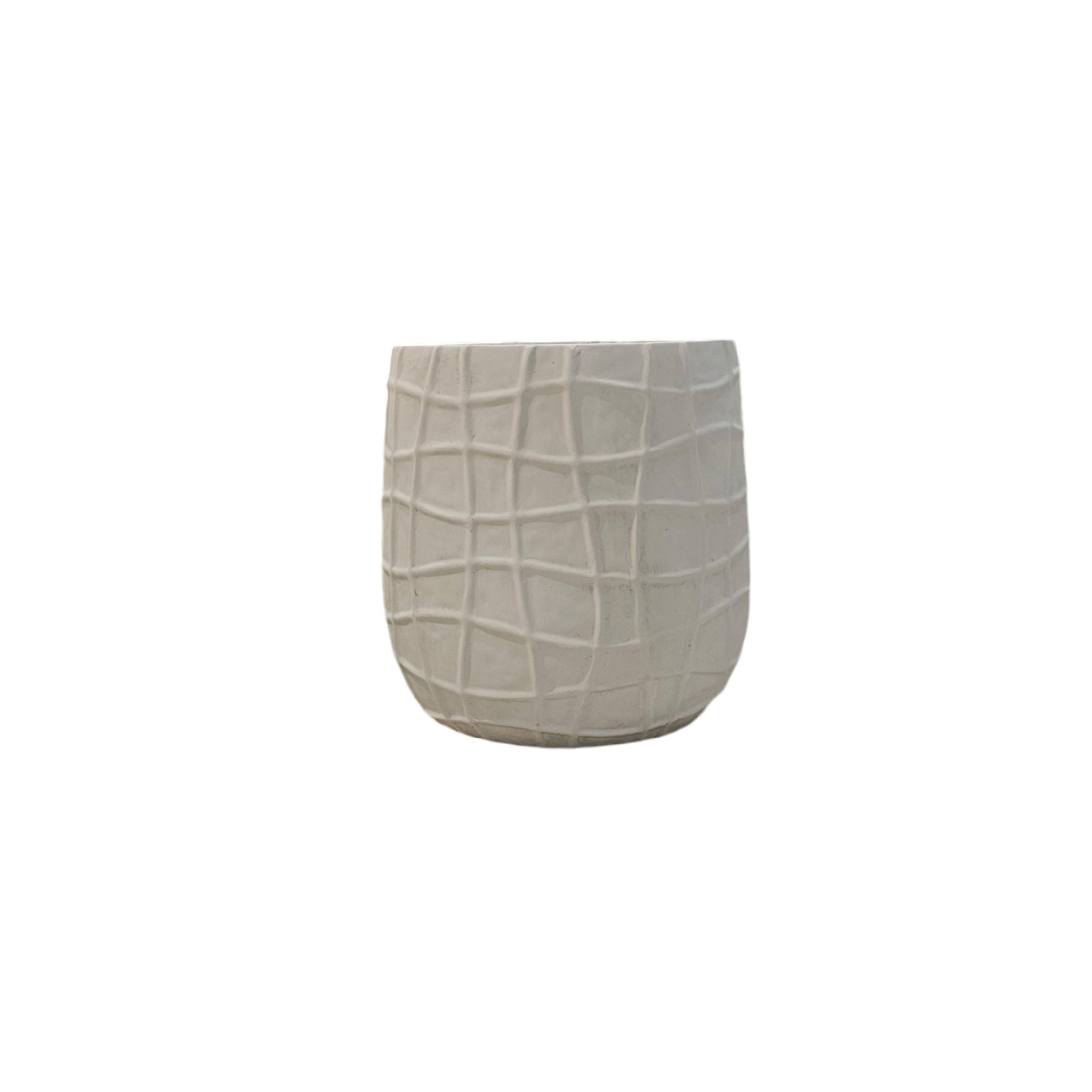 Macetas hechas en resina blanco con diseño en relieve, ideales para unas hermosas plantas en tu hogar.