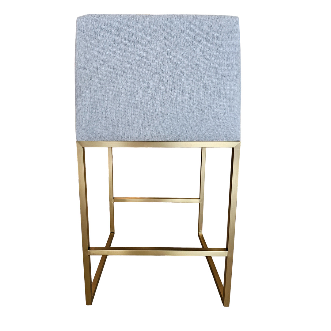 El asiento y respaldo están tapizados en tela de textura suave, ideal para integrarse en cocinas contemporáneas, desayunadores o barras tipo counter. Su silueta refinada añade un toque de sofisticación sin recargar el espacio visual.