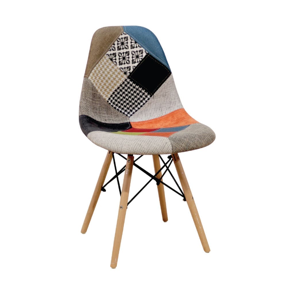 Silla con parches en tela y patas en madera
