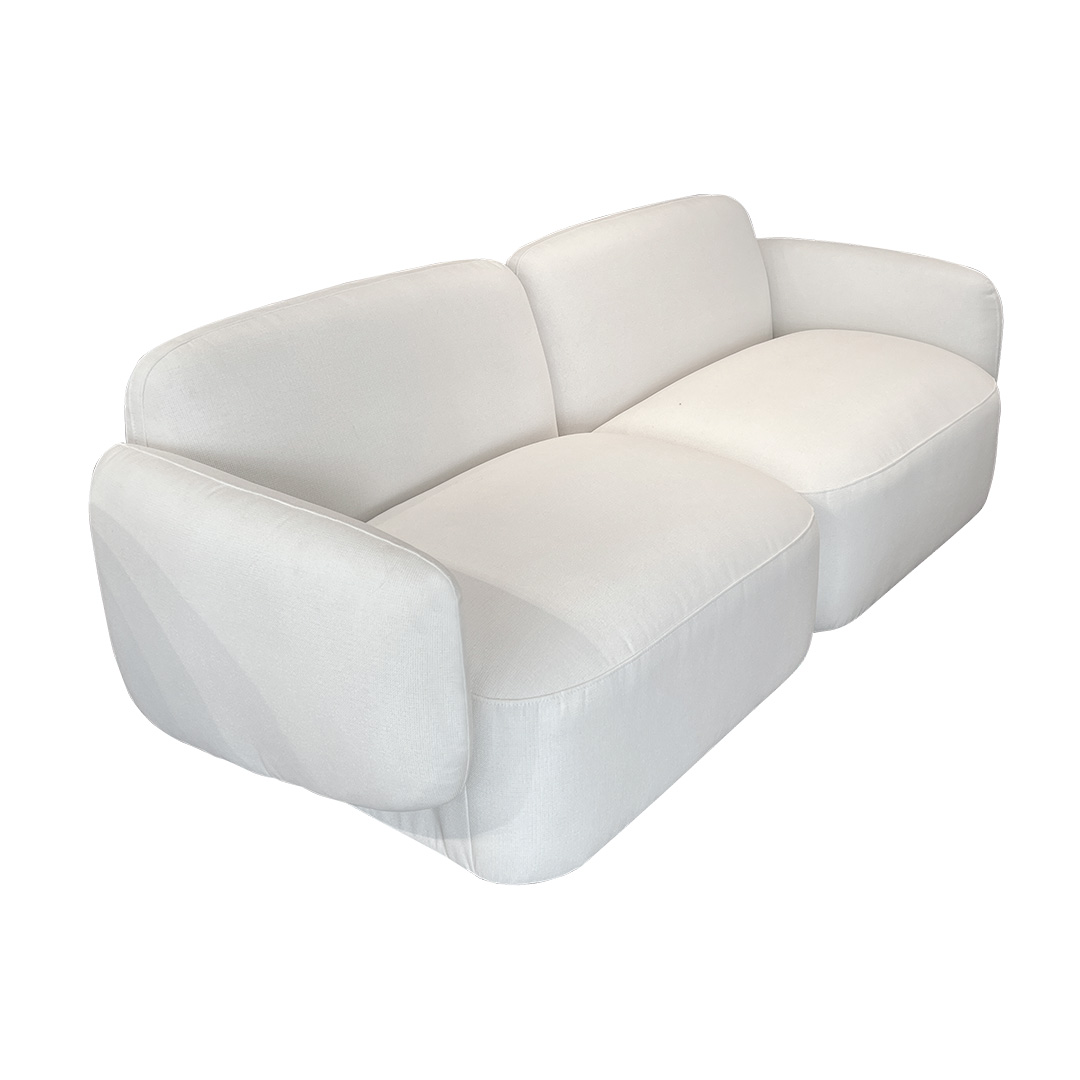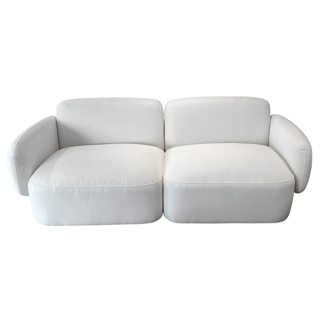 Renueva tu espacio con este moderno sofá de dos piezas con brazo, envuelto en una elegante tela blanca. Su diseño versátil y estilizado lo convierte en la pieza que tu salón necesita.
