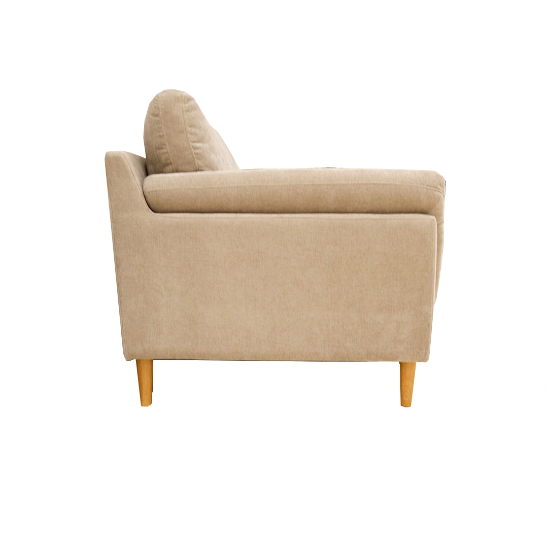 Su tapizado en tela beige clara le otorga un aire sereno y acogedor, mientras que sus patas de madera aportan ese toque cálido y natural que toda sala necesita. Con capacidad para tres personas, este sofá es perfecto para reuniones, siestas o simplemente para disfrutar de una tarde de lectura.