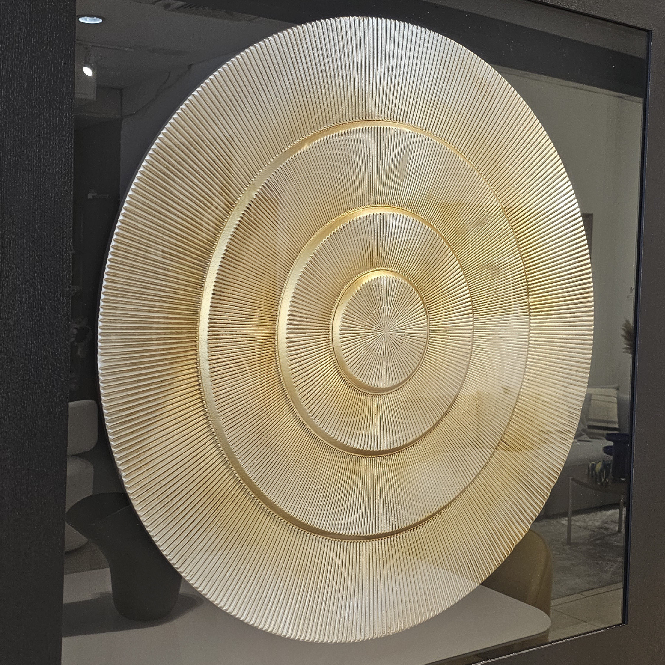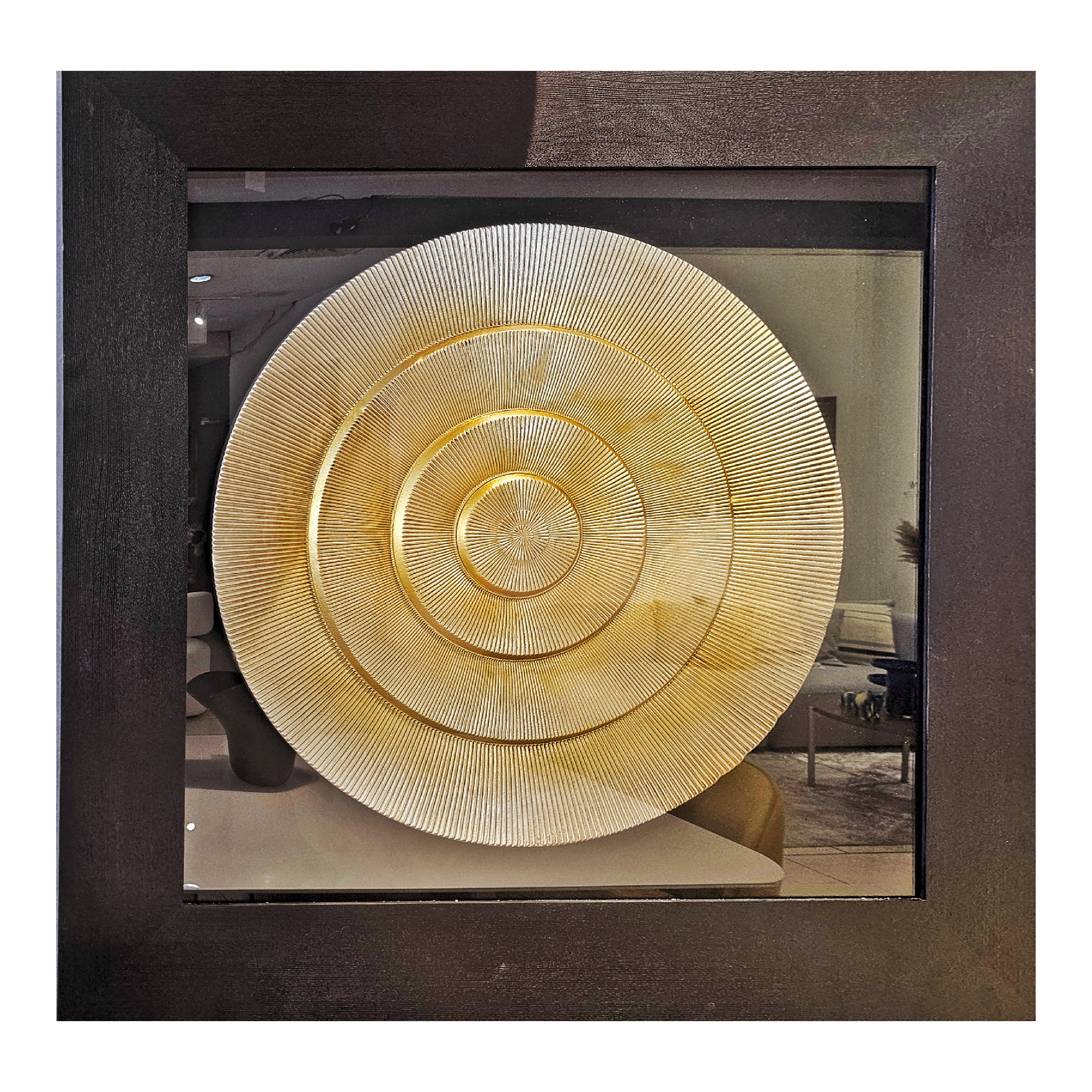 Cuadro tipo walldecor con disco dorado como pieza principal de la composición, viene enmarcado con vidrio y marco en madera de color negro.